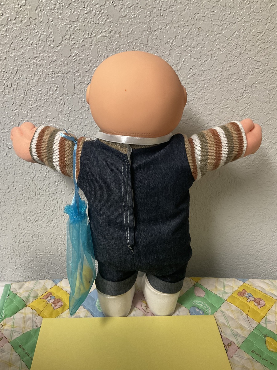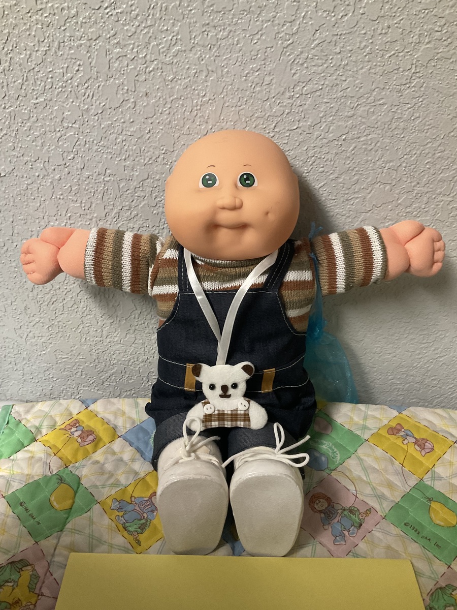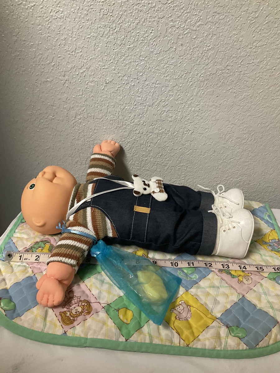 This handsome little boy has a bald head and pretty green eyes. He is from the SS Factory and he has a brown 1984 signature. He is wearing a BRAND NEW outfit, a NEW diaper, socks, and CPK shoes. He loves his little bear!! He has a more modern look now and is FULLY DRESSED (which counts for a lot!) He is in overall very good vintage condition for his age of 41-almost 42 but please bear in mind that she is still a vintage item-NOT NEW and therefore NOT PERFECT but definitely restored!! Just look at him standing all by himself!! Please see all pics as they are part of the description. He comes from m smoke free home although I am not his original owner. Sold AS IS.