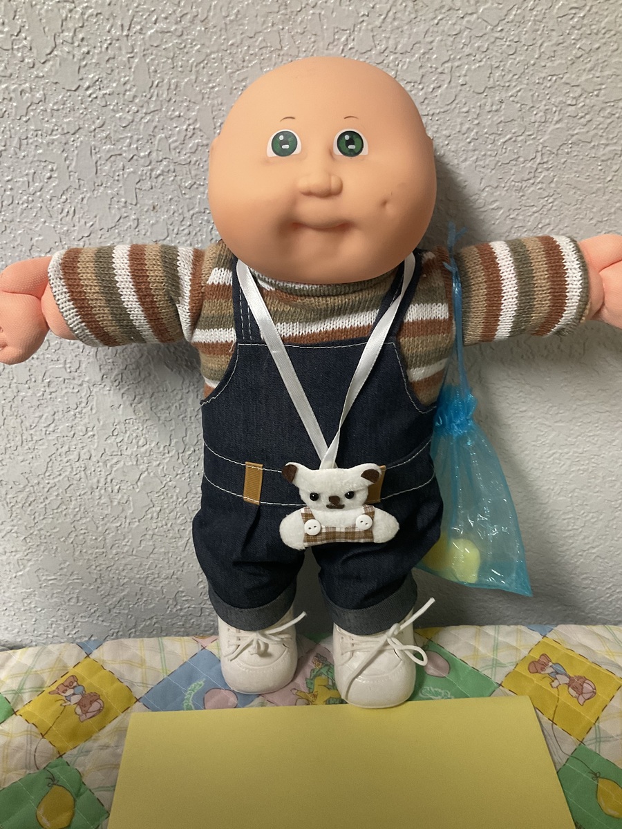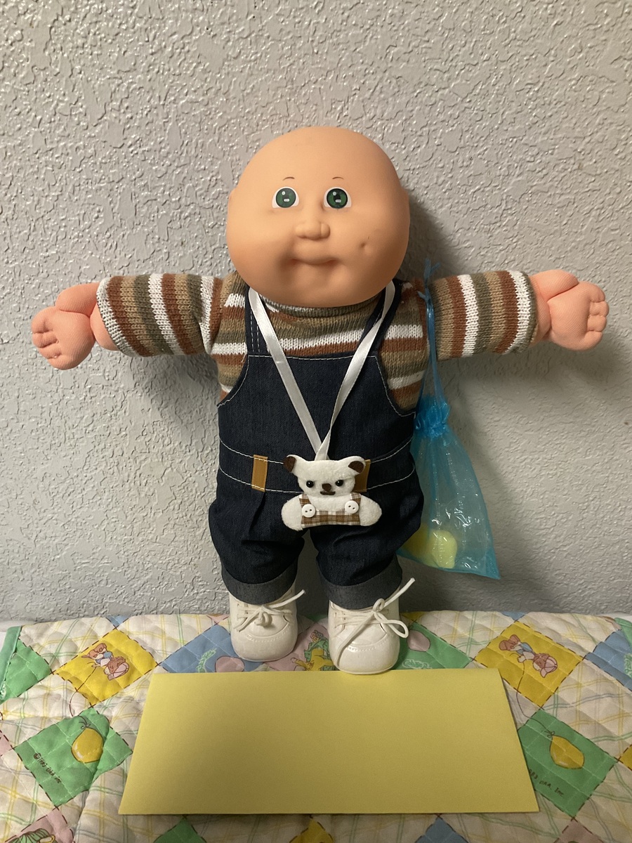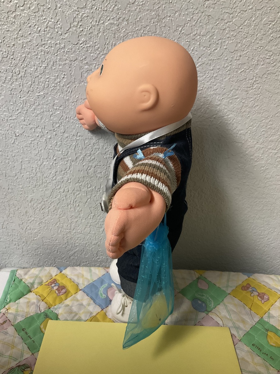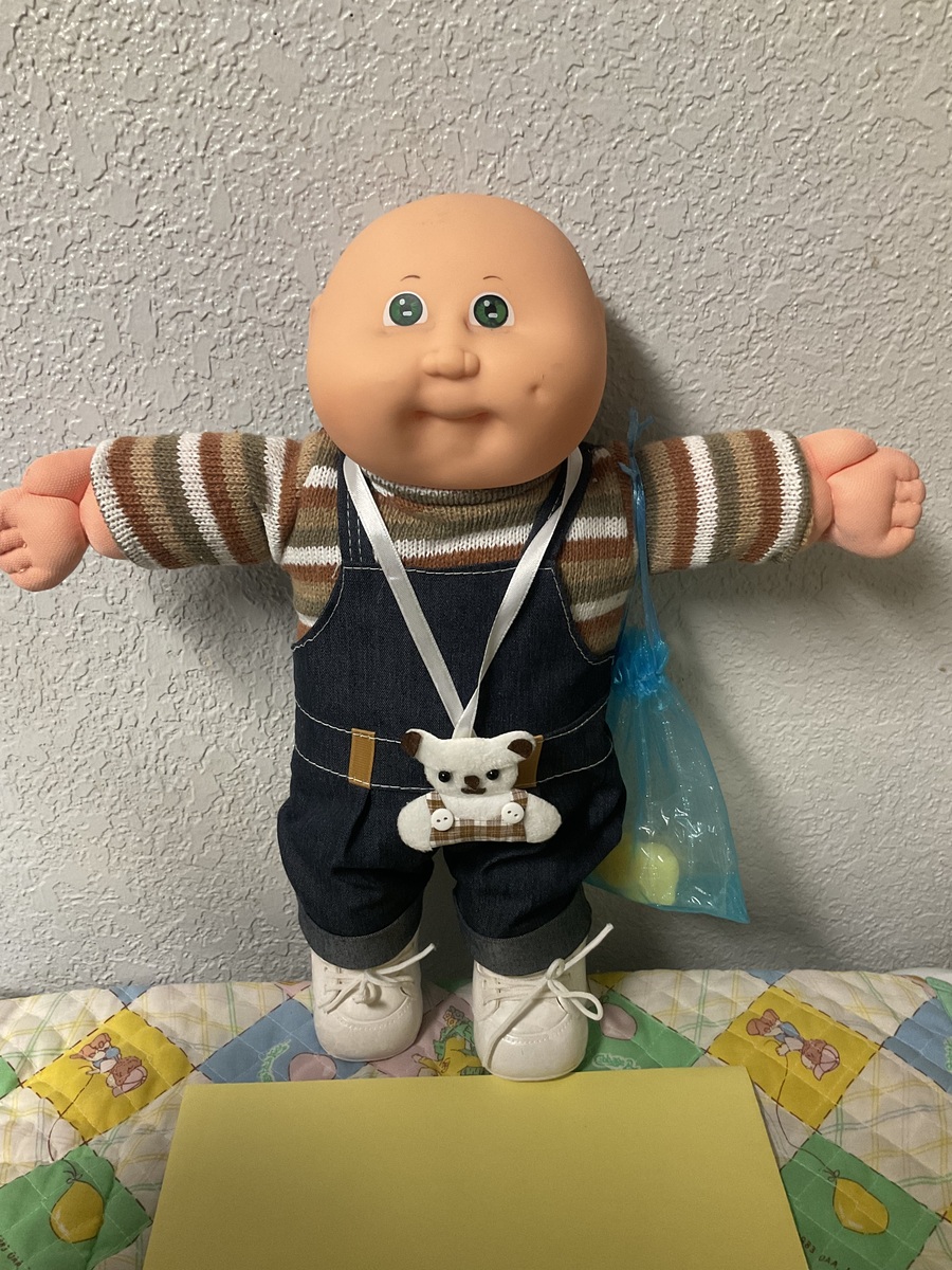 This handsome little boy has a bald head and pretty green eyes. He is from the SS Factory and he has a brown 1984 signature. He is wearing a BRAND NEW outfit, a NEW diaper, socks, and CPK shoes. He loves his little bear!! He has a more modern look now and is FULLY DRESSED (which counts for a lot!) He is in overall very good vintage condition for his age of 41-almost 42 but please bear in mind that she is still a vintage item-NOT NEW and therefore NOT PERFECT but definitely restored!! Just look at him standing all by himself!! Please see all pics as they are part of the description. He comes from m smoke free home although I am not his original owner. Sold AS IS.