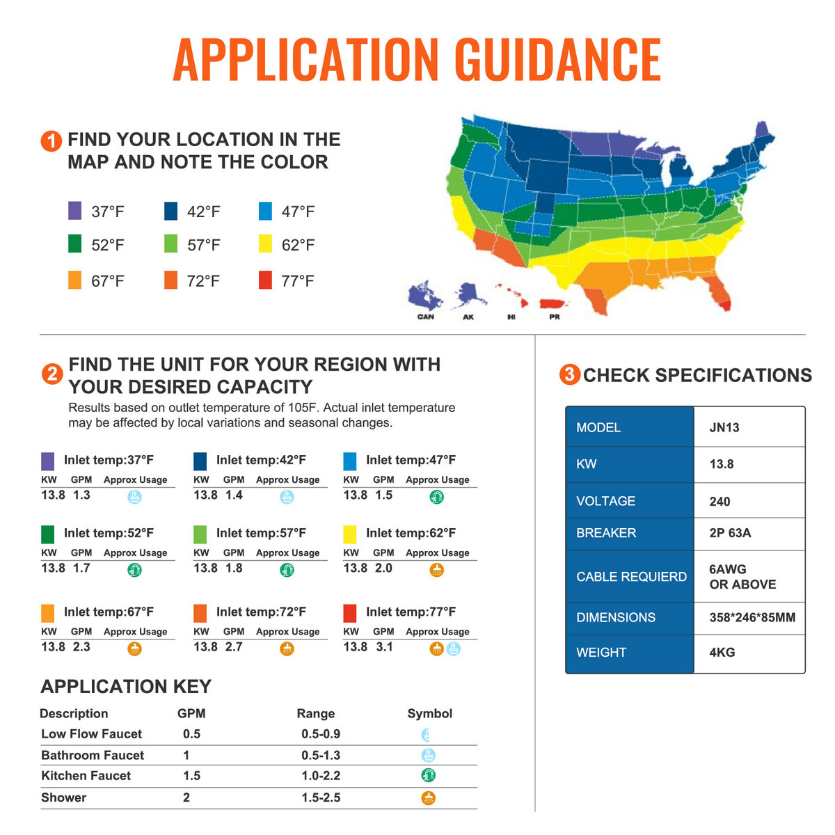 Know about Installation: Wall-mount design maximizes your living or working space. Our compact electric water heater comes with NPT 1/2'' water inlet and outlet. Please note that 1 x 70A circuit breakers and a 6 AWG power cables are required for installation, and we recommend seeking professional assistance.