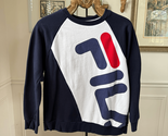 Men?s Fila, cotton and polyester blend logo Emmett sweatshirt. Colorblock in navy blue, white and red. Laying flat measures 24 inches shoulder to hem and 22 inches armpit to armpit..