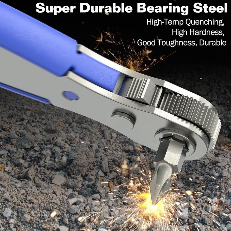 About this item [Small and Handy Ratchet Wrench] This right-angle screwdriver is 3.97 inches long and 0.34 inches thick, ideal for working in tight places/tight spaces/tight spots where traditional drill bit drivers, traditional ratchet screwdrivers may be too large or bulky to fit. Rendering easy fastening and unfastening with sufficient torque, especially in awkward places like U shape corner, lateral surface, making repairs easier and faster than ever. [Practical Gift] The right-angle screwdriver comes with exquisite packaging and is a great choice for Christmas stocking fillers, Thanksgiving gifts, Father's Day gifts, Mother's Day gifts and Valentine's Day gifts. Perfect for Dad, Stepdad, Husband, Grandpa, Wife, Boyfriend, Coworker, Handyman, Car Mechanic, DIY Enthusiast. They will love this simple and practical gift. [Widely Use] The Mini Ratchet Set is an essential multi-tool to tackle all repair jobs, whether you need a sewing machine tool, appliance repair tool, computer repair tool, bicycle repair tool, or need help assembling blinds, door handles, shelves, TV stands, bed frames or furniture, this handy tool will meet your needs. [Exquisite Mechanism] This right angle combination screwdriver set features a unique 36-tooth reversible ratchet system to ensure smooth ratcheting rotation in both directions and more precise adjustment than a 16-tooth ratchet. Simply push the drill bit into the square opening and flip the button to change the direction of tightening or loosening the screw. This efficient system speeds up work and saves time. [17in1 ratchet wrench set] The hex key socket set includes 10 drill bits and 6 mini sockets (5mm, 6mm, 7mm, 8mm, 9mm, 10mm), 1 drill bit extension adapter in addition to the mini ratchet wrench. A variety of slotted, phillips, pozidriv and torx star drill bits make it a comprehensive set of tools. The universal handle fits 1/4" hex socket hex drill bits, perfect for sewing machines, sinks, desks, etc.