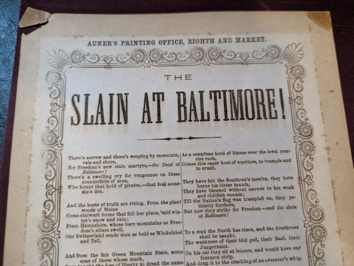 1861 Slain À Baltimore Guerre Civile Riot Broadside Ballad Auner Phila 9.5 x 6