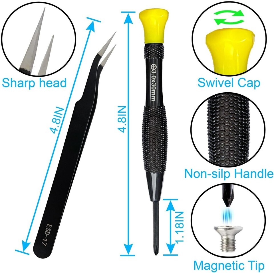 About this item Blackened steel ??Wide Range of Applications? Precision screwdriver can easily tighten or loosen small screws in some household everyday products: glasses, watches, laptops, tablets, cameras, jewelry, Android / iPhone, toys and other electronic products. ?? High quality material ? Small screwdriver sleeve rod Screwdriver sleeve rod is made of chromium-vanadium alloy steel blackening process, durable, corrosion and oxidation resistant. The cutter head is magnetic, and in addition, it is equipped with a magnetizer to make the screwdriver more capable of absorbing small screws. The ESD17 tweezers is made of stainless steel, painted to protect against static electricity, and have prongs that can easily grip small screws. ??Keep Organized? Mini screwdriver set with case is equipped with a transparent storage box to prevent loss, the screwdriver head comes in 4 different colors, red is a flathead screwdriver, yellow is a Phillips screwdriver, purple is a Pentalobe screwdriver, blue is a Torx screwdriver, and the handle is also marked with size and head edge, so it is easy to remove the screwdriver you want at a glance. ??Ergonomic Design? The head of the precision screwdriver kit is designed with a smooth rotating head, and the handle is covered with a fishscale frosted particle surface, which enables non-slip comfortable control and faster rotation of the screw when screwing. ??What You Get? Precision Screwdriver Set With Case include 5 X red Flathead screwdrivers: 3/64IN(1.2) 1/16IN(1.5) 5/64IN(2.0) 3/32IN(2.5) 1/8IN(3.0), 4 X yellow Phillips screwdrivers: PH0000(1.2) PH000(1.5) PH00(2.0) PH0(3.0), 2 X purple Pentalobe screwdrivers:1/32IN(0.8) 3/64IN(1.2), 5 X blue Torx screwdrivers: T5 T6 T7 T8 T9, Tweezers: ESD17, Magnetizer, Transparent box.