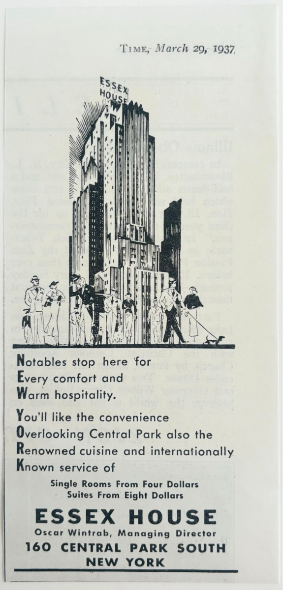 1937 Essex House Hotel New York Advertisement Central Park NYC Vintage E90G3