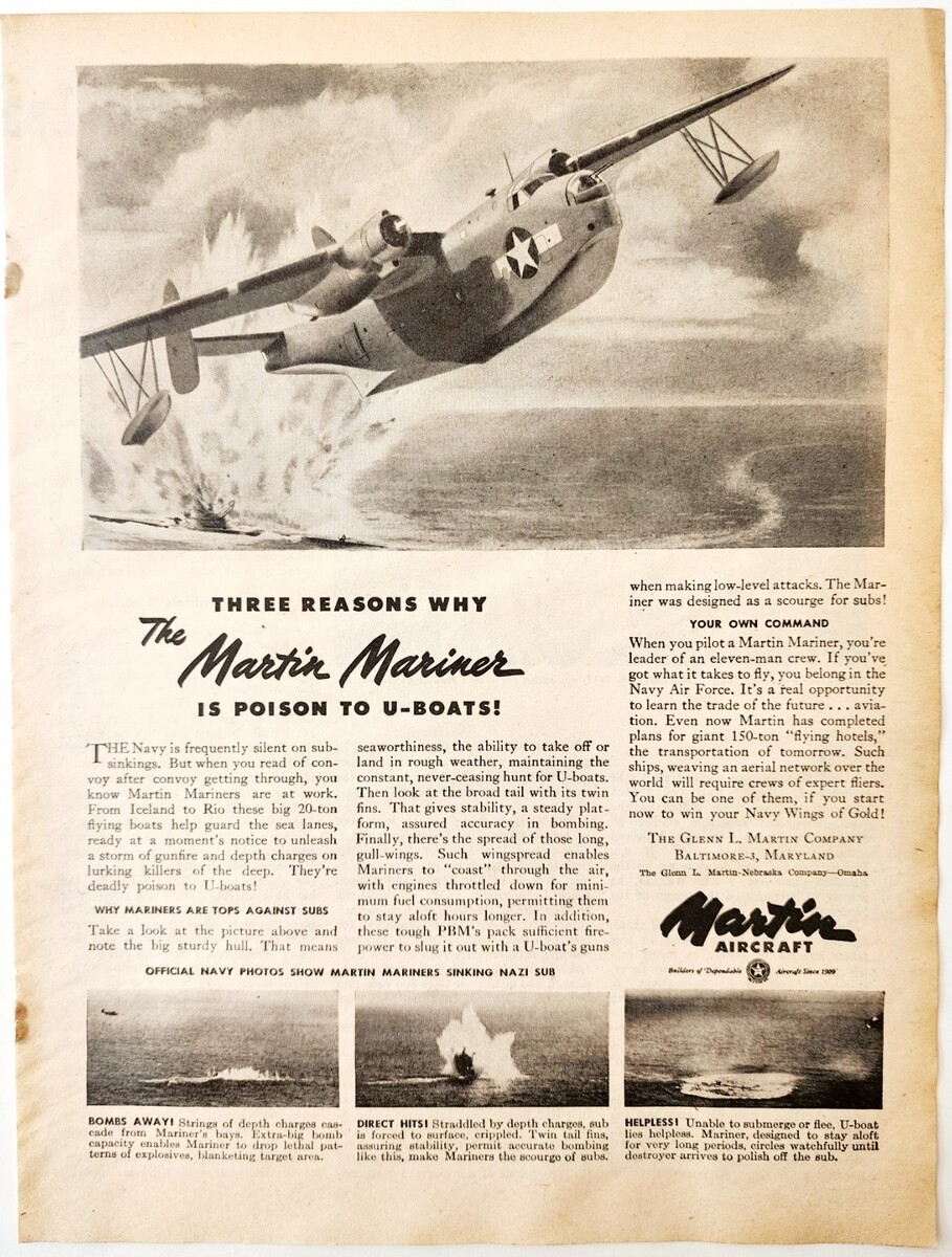 1944 Martin Mariner Aircraft U-Boat Bomber Advertisement WW2 Era Aviation DWP7C