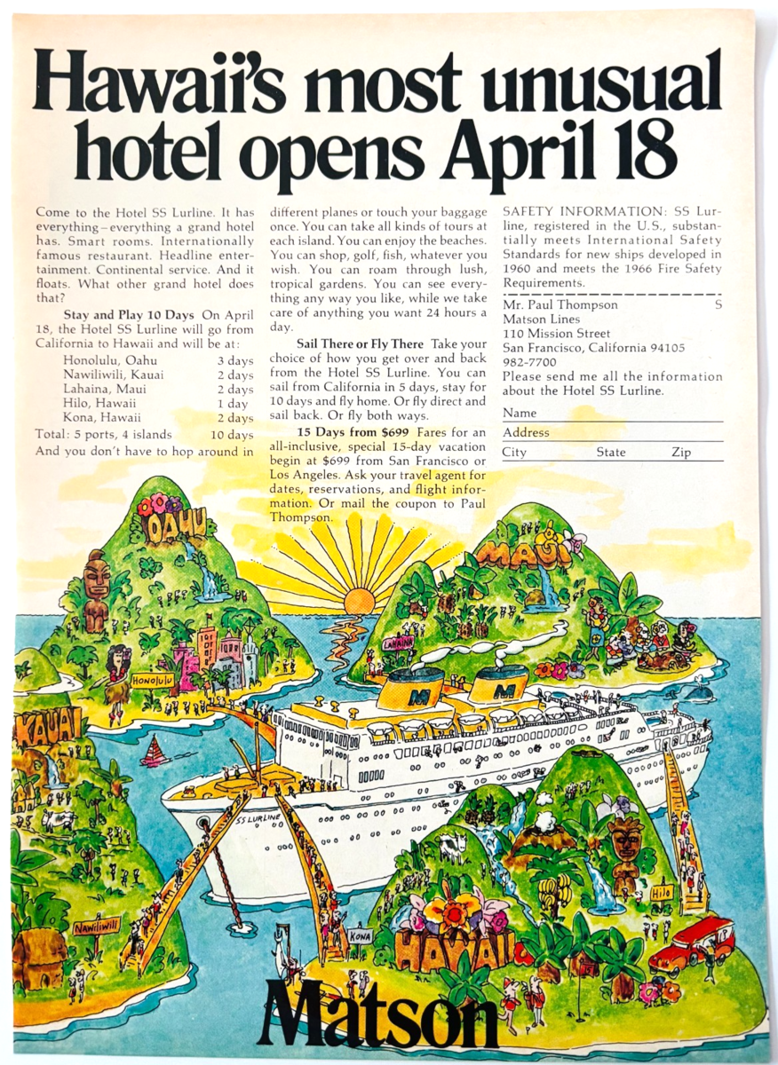 1969 Hotel SS Lurline Hawaii Cruise Advertisement Matson Vintage Travel DWW10B