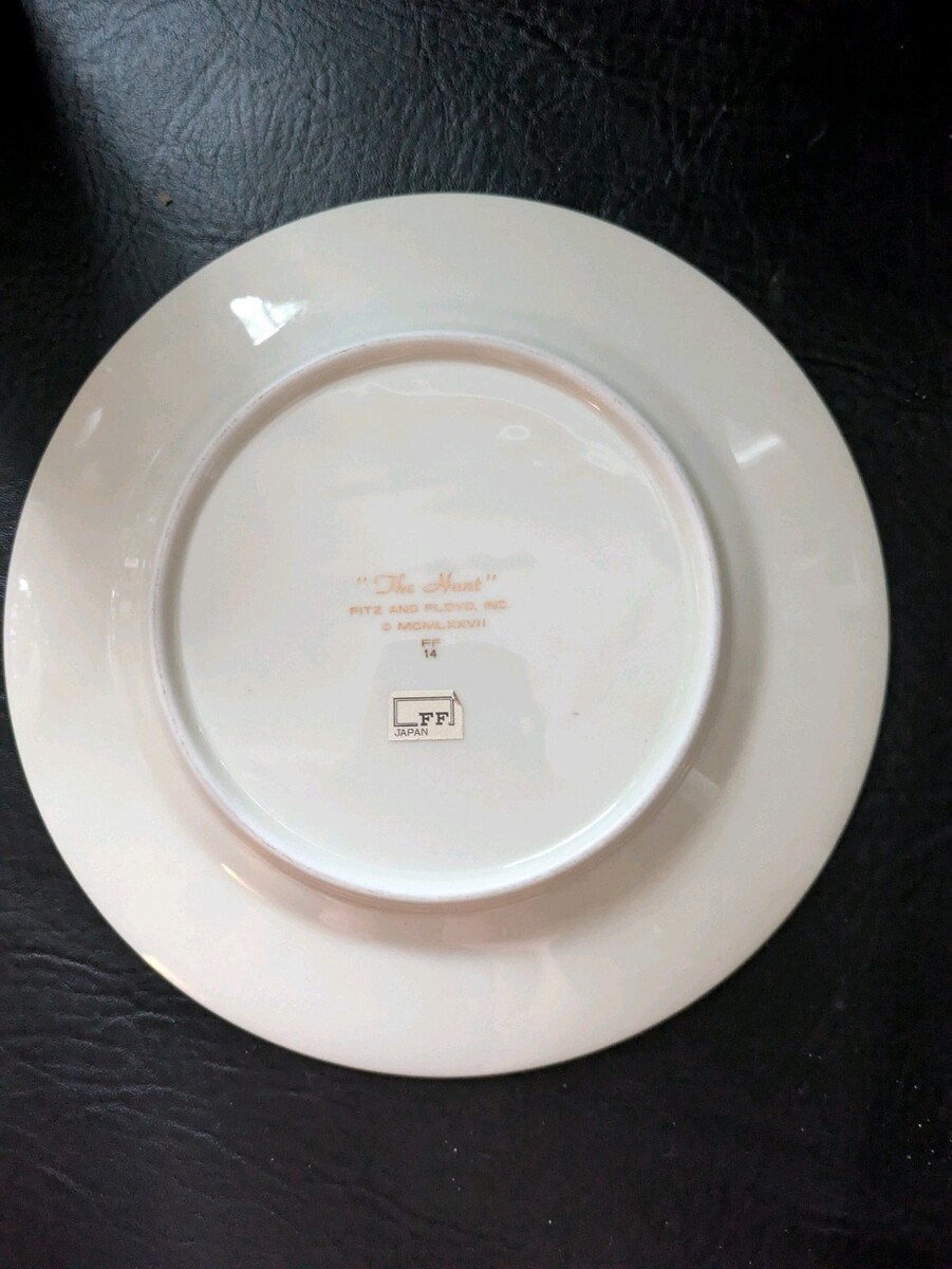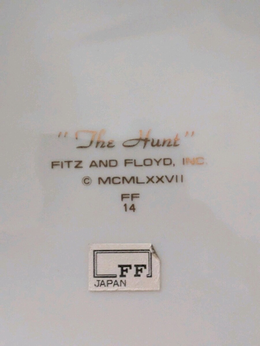 El producto es un plato de ensalada "The Hunt" de Fitz Floyd de 1978 que presenta un encantador tema de caza del zorro. Hecho de porcelana con un acabado brillante, el plato presenta una combinacion de colores crema, marron y dorado. Con un diametro de 7 1/2 pulgadas, esta pieza decorativa fue fabricada en Japon y agrega un toque de sofisticacion a cualquier mesa de comedor o coleccion de ceramica y vidrio. Perfecto para servir ensaladas o postres con un toque de elegancia vintage.