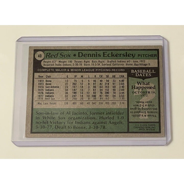 This is a 1979 Topps Baseball Card featuring Dennis Eckersley of the MLB's Boston Red Sox. This original trading card is made of 20 pt. card stock and belongs to the 1979 Topps Base Set. It has a standard card size and bears the card number #40.