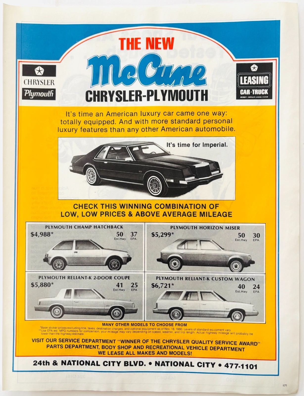 1981 McCune Chrysler Car Dealership Advertisement Vintage San Diego DWV11B