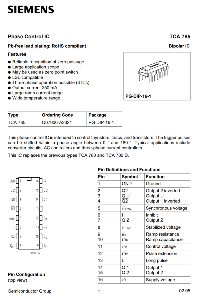 1X TCA785P Infineon Phase Control IC for Thyristors and Triacs 8V to 18V DIP-16