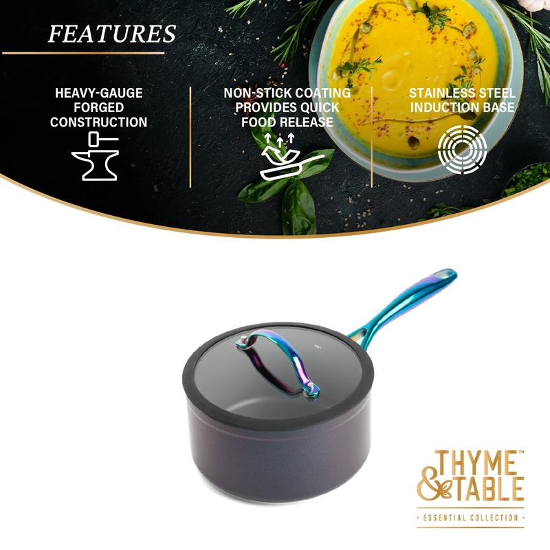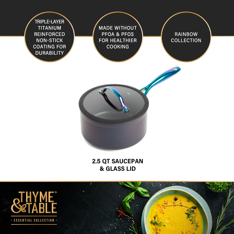 Perfect for simmering a sauce and whisking a roux, this Thyme Table non-stick 2.5 Quart rainbow sauce pan is a must-have for every chef, plus it adds a playful pop of color to your kitchen. Incudes fitted glass lid. Stainless steel induction base. Oven Safe up to 500 F. Great for Gas, Electric, Halogen and Induction cooktops. Ergonomic riveted handles for stability. Quick food release. Heavy gauge construction.