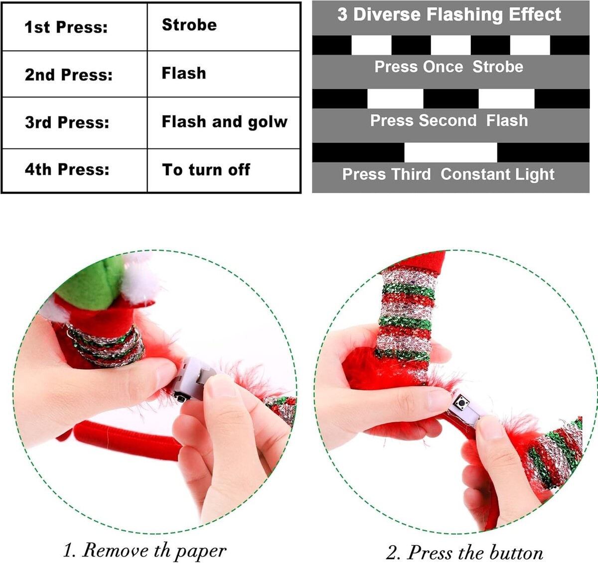 : these Christmas headbands have LED lights that shine brightly, we provided batteries in them, so you can attach them to your head easily, and help you quickly enjoy the Christmas party