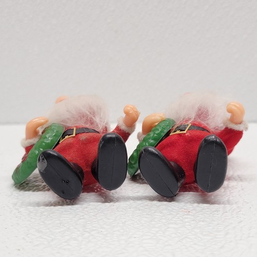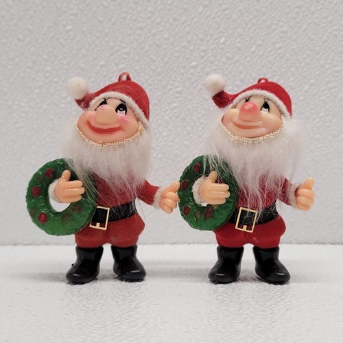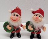 2 Vintage Plastic Flocked Felt Dwarf Santa Helper Wreath Christmas Ornaments