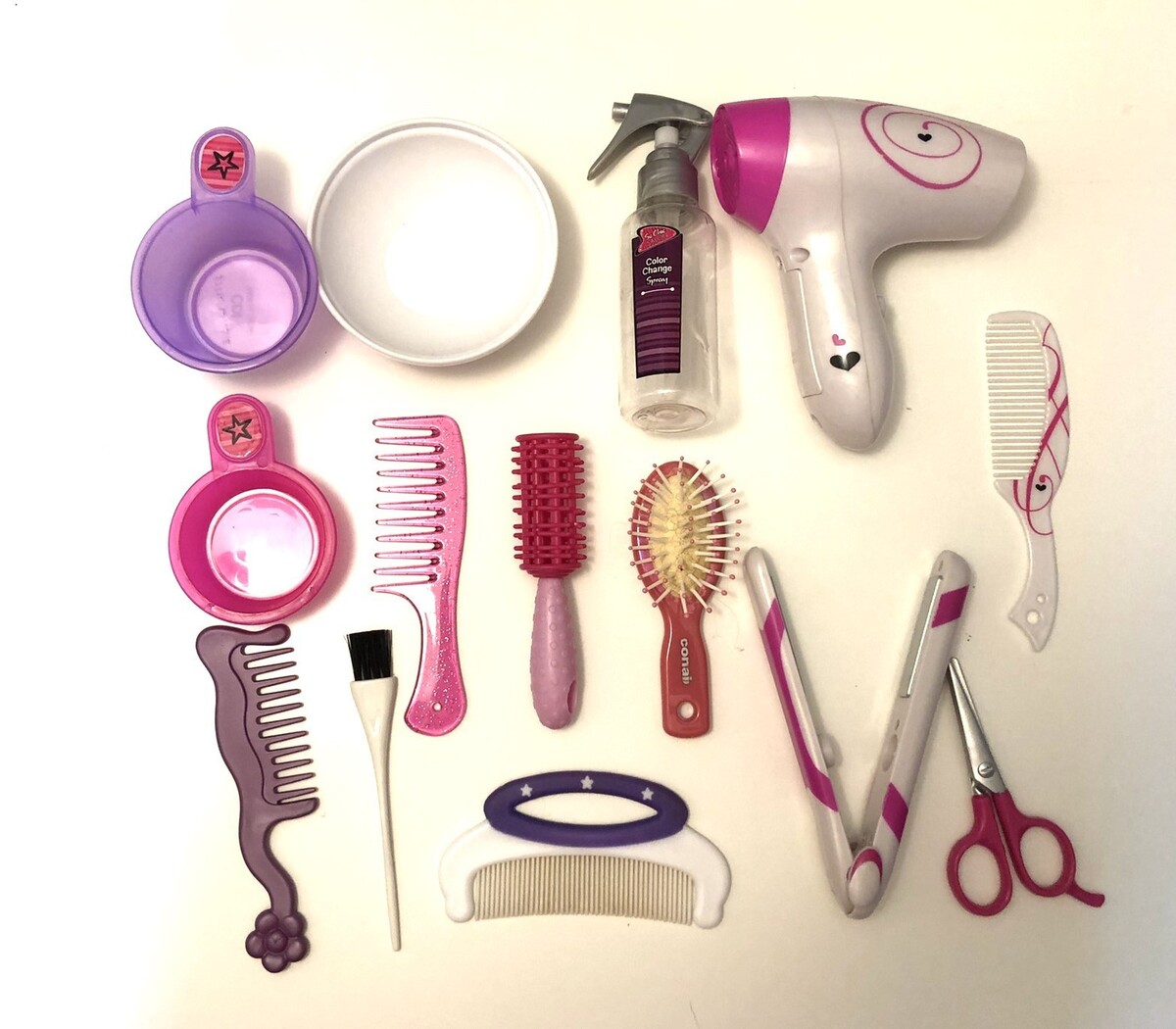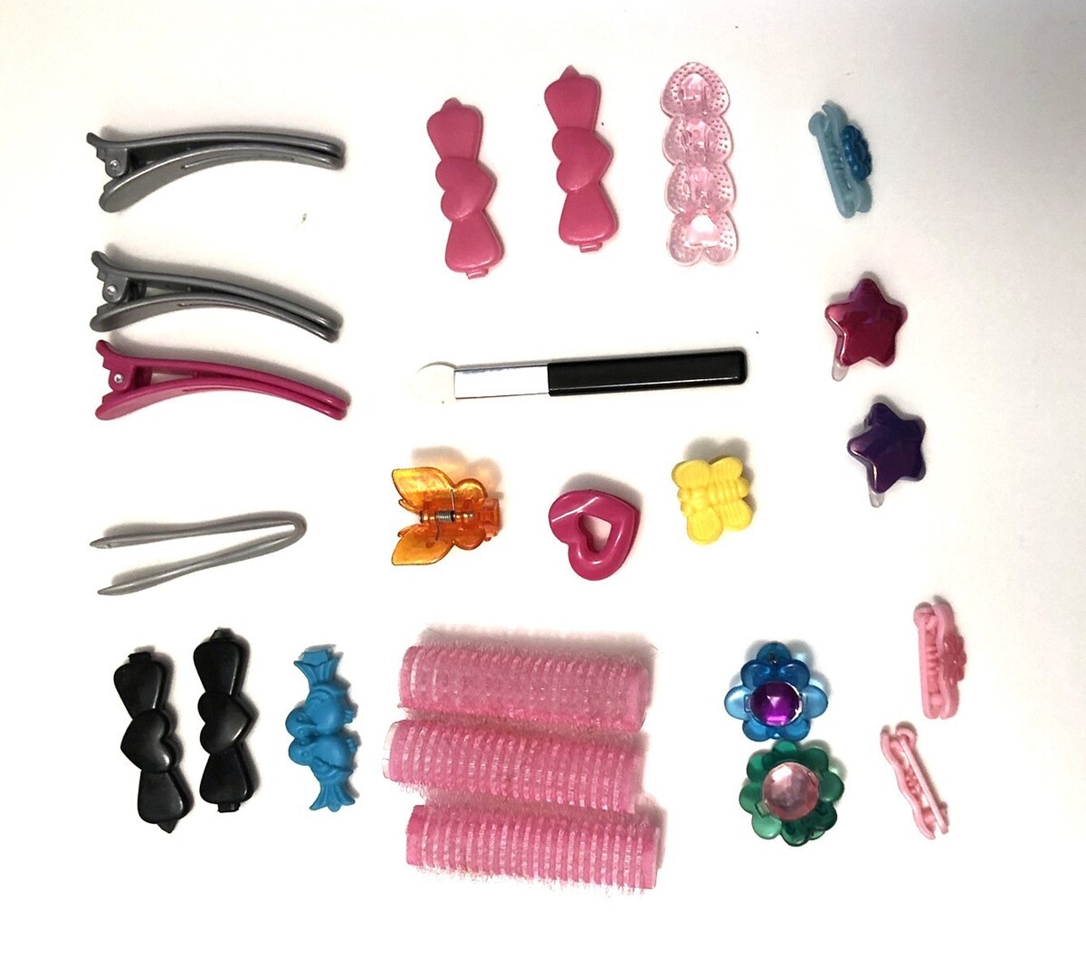 2006 Barbie Color 'n Style Styling Head Teresa K9236 with Lots of Extras. The set comes with a blow dryer that makes noise, flat iron, brushes and barrettes, curlers, clips, scissors, spray bottle, hair dye brush, bowl apron.