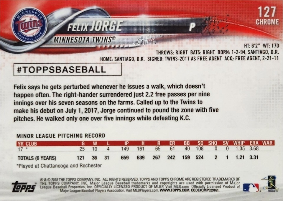 - 2018 Topps Chrome #127 Felix Jorge Twins RC Rookie Card MLB TWINS JUST PULLED!