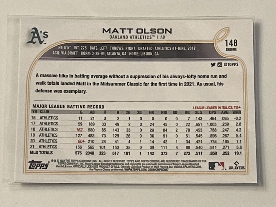 2022 Topps Chrome - Matt Olson* Card #148 - MLB Oakland Athletics/MLB Braves ATL