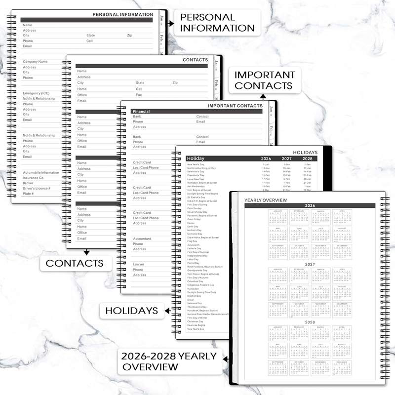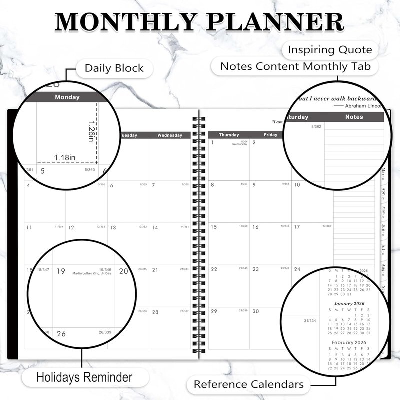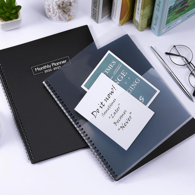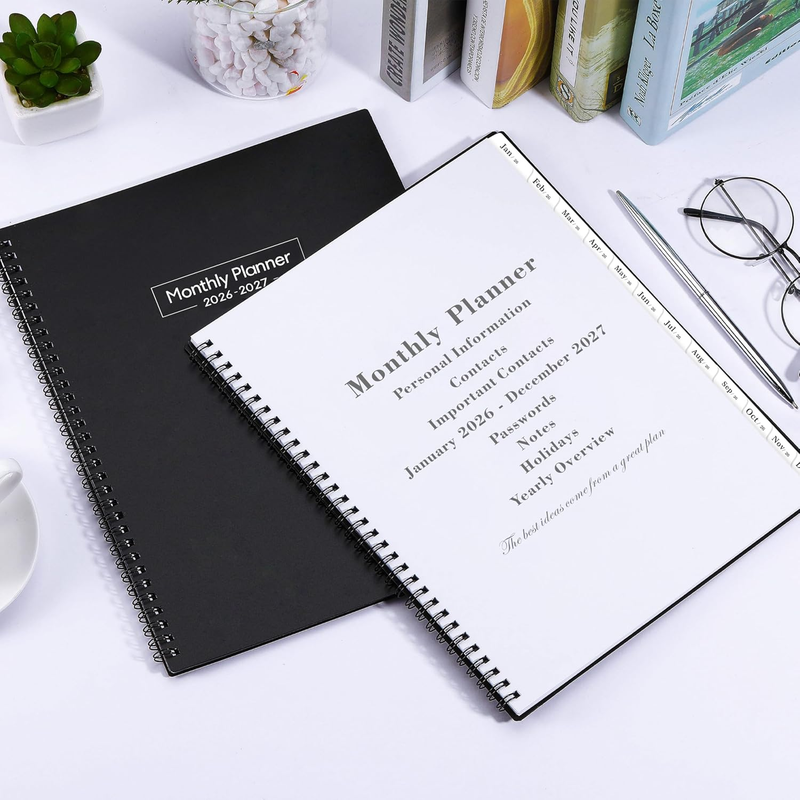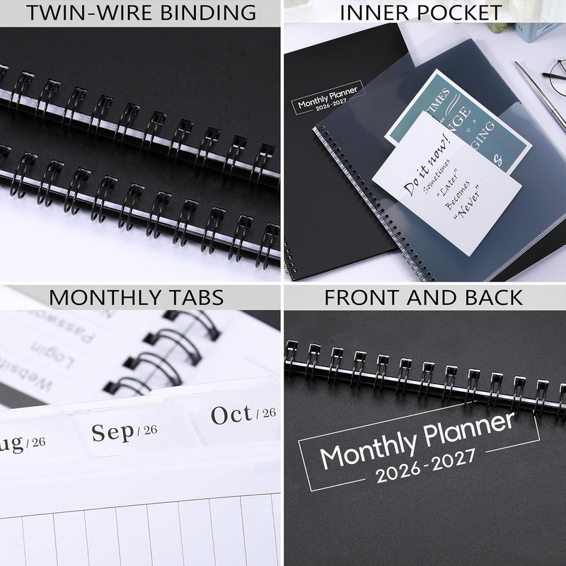 PROFESSIONAL DESIGN -The special design of the 2026-2027 monthly planner is 11.4" x 9.2" Planning Pages Hardcover Monthly Tabs Thicker Paper 24 Monthly Notes Strong Twin-Wire Binding Inner Pocket Yearly Overview of 2026-2028 4 passwords pages 4 important contact pages 8 contact pages 13 extra note taking pages with lines. There are inspiring quotes on the page every month to keep you motivated throughout the month.