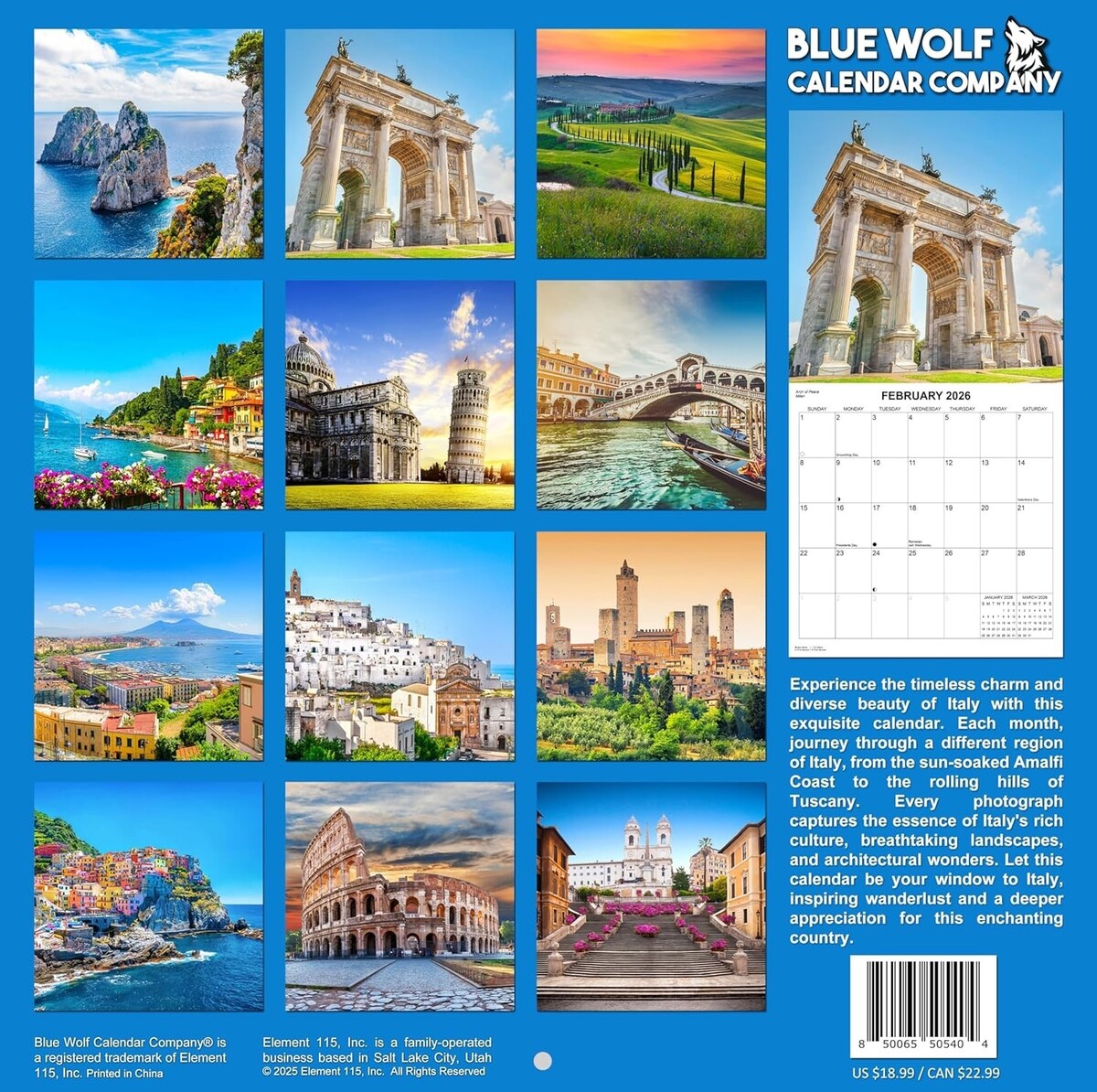 Each month highlights Italy?s scenic landscapes, historic landmarks, and timeless charm.