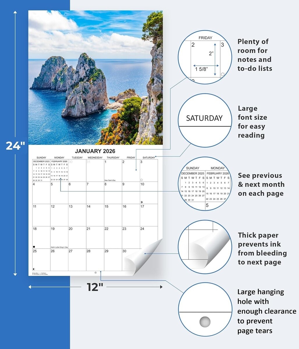Measuring 12" x 24" when open, this calendar is a striking addition to any wall.