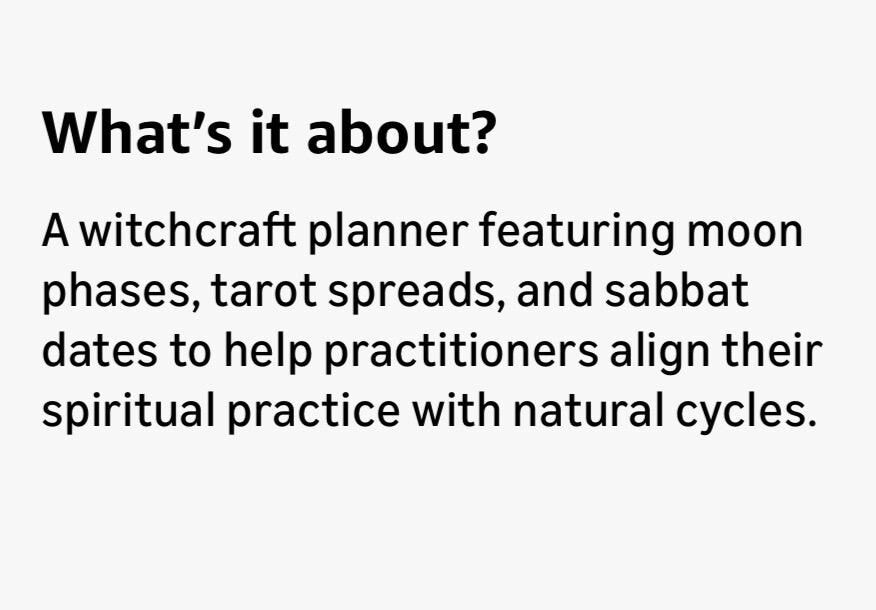 Ditch ordinary or overwhelming planners and claim your power with a yearlong guide crafted for witches who live by the moon and manifest with purpose. Designed for witches, mystics, and spiritual seekers, this planner helps you align your goals with lunar cycles, astrological transits, and seasonal sabbats?all while creating space for personal growth, ritual, and reflection.