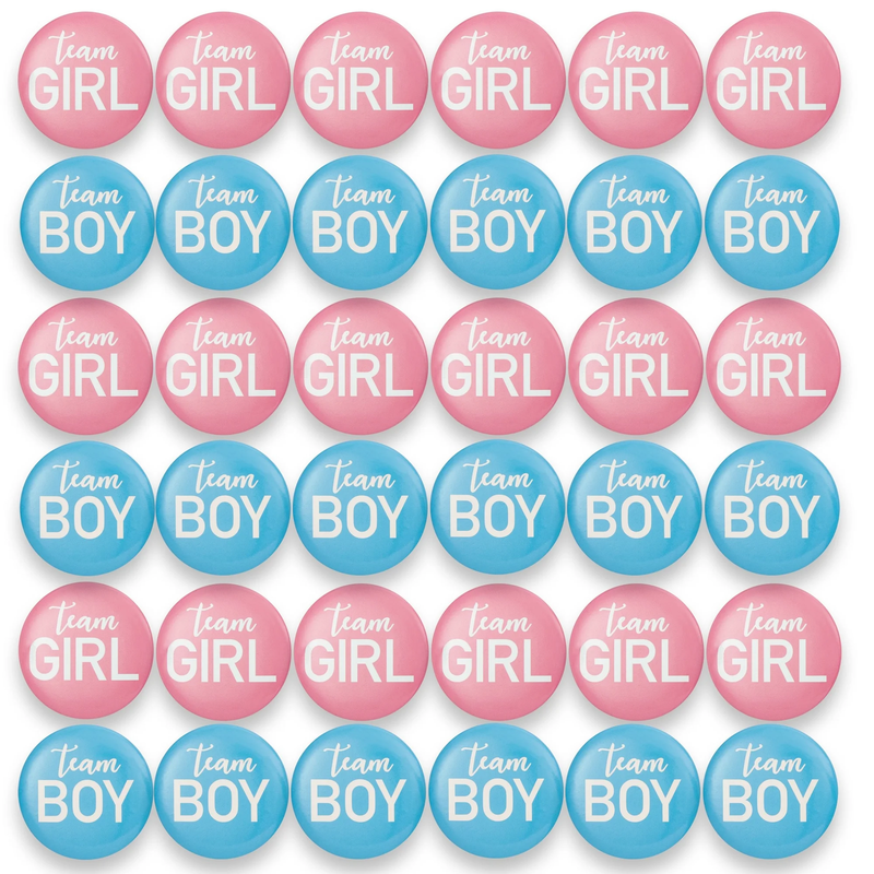 Gender Reveal Party Favor: Add excitement to your gender reveal event with these delightful pink and blue gender reveal pins that are perfect for creating lasting memories and keeping guests engaged Engaging Party Game: Let friends and family join in the anticipation and make their predictions with these charming gender reveal buttons that can be worn on clothing, bags, and purses for a fun and exciting gender reveal game Perfect Size: Each one of our team boy or team girl gender reveal pins measures 2.25 inches, making them an ideal accessory to wear throughout the celebration Easy-to-Use Design: Our boy or girl pins are crafted with convenient easy-to-open clasps and durable plastic backings, helping to ensure hassle-free attachment and comfortable wear for all your guests Comes With: Get ready for a friendly competition with a set of 24 blue and pink pins; includes 12 blue "Team Boy" button pins and 12 pink "Team Girl" button pins, making it a fun way to involve everyone at the gender reveal party