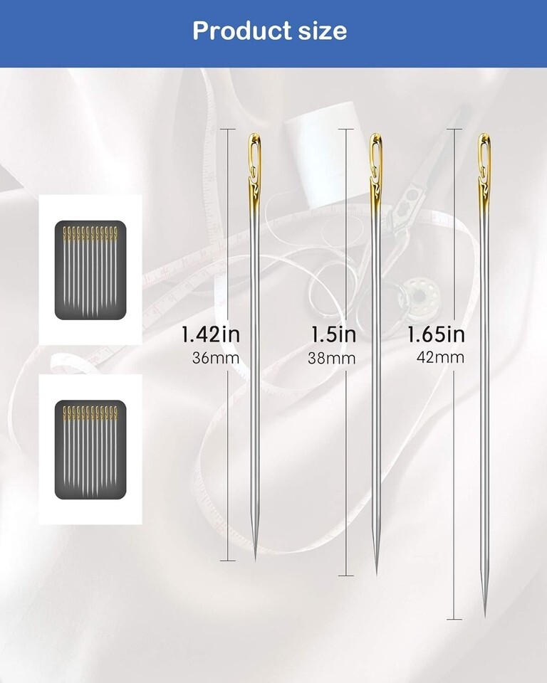 About this item PREMIUM MATERIAL FOR STABLE PERFORMANCE ? Made of high-quality stainless steel, our hand sewing needles are built to easily go through thick fabrics such as canvas and denims. They are also rustproof and corrosion resistant for longer service life. THREAD YOUR NEEDLE WITHIN QUICK! ? Thanks to the special side-threading design, self-threading needles can be easily threaded within quick! An easy and effortless start will save your time and keep you concentrated for your projects. 24 ASSORTED HAND SEWING NEEDLES ? The package includes 24 self-threading embroidery needles of 3 different sizes, 8 pcs for each 1.65-inch, 1.5-inch and 1.42-inch size. The different sizes are suitable for various fabrics and sewing requirements. WIDELY USED PERFECT FOR EVERYONE ? Our self-threading needles are perfect for all kinds of hand sewing projects and daily mending. The smart design saves you time and effort putting thread through needle eyes, which is especially great for elderly people. WHAT YOU GET ? You will receive 48self-threading sewing needles of 3 different sizes, all made of stainless steel. If you ever have any question about the product, please feel free to turn to us, we are always ready and glad to help you!
