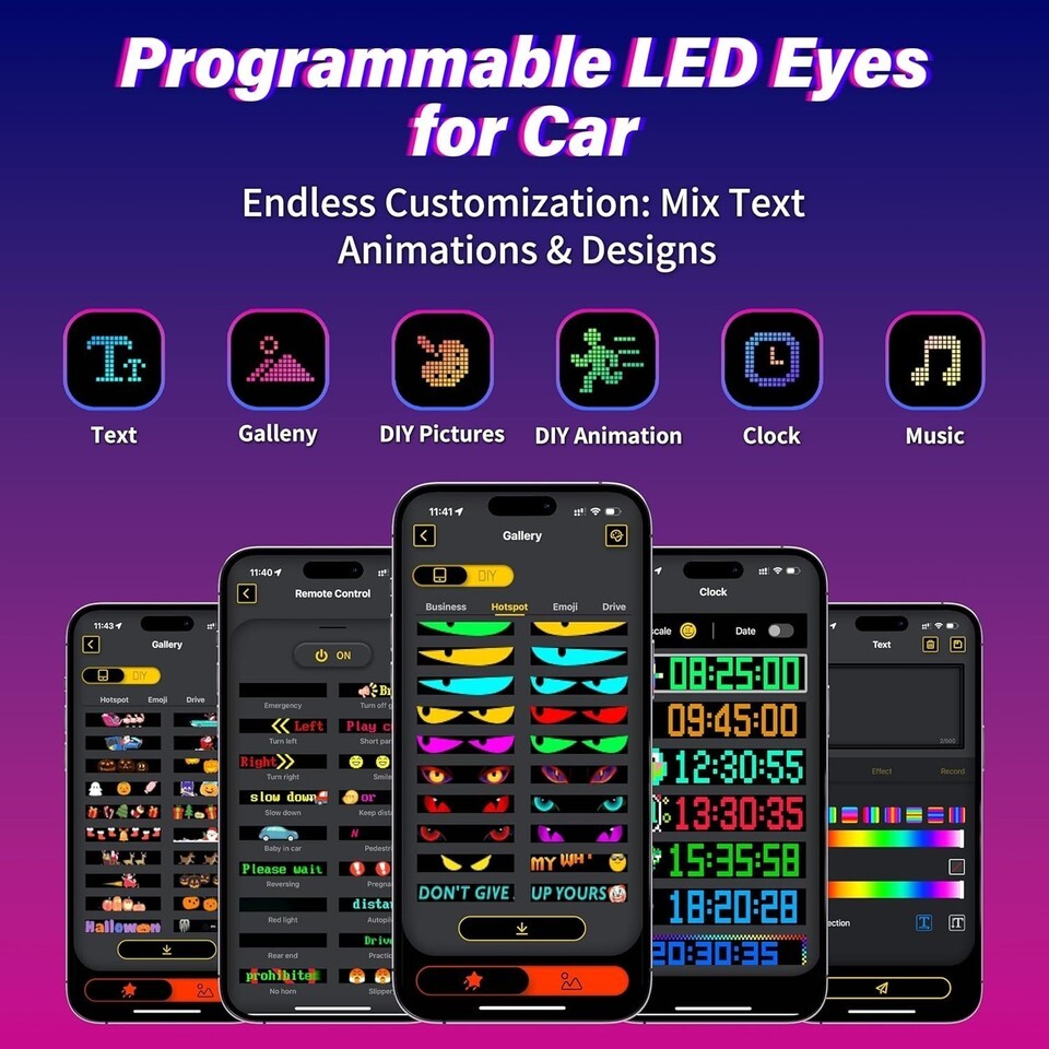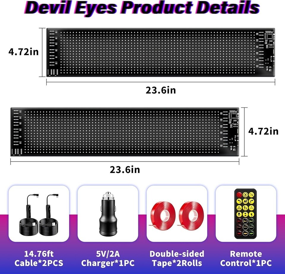 Add bold style and dynamic lighting to your vehicle with this 2PCS LED Devil Eyes Flexible Windshield Light Kit. Each ultra-thin LED panel measures 23.6 x 4.72 inches and features programmable animations, emojis, and text that you can fully customize using the mobile app or included remote control.