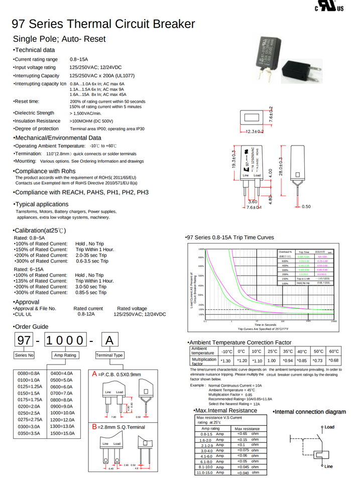 Primary image for 2X 97-0500 YZ 5A Auto Reset Thermal Circuit Breaker PCB Single Pole 125/250 VAC