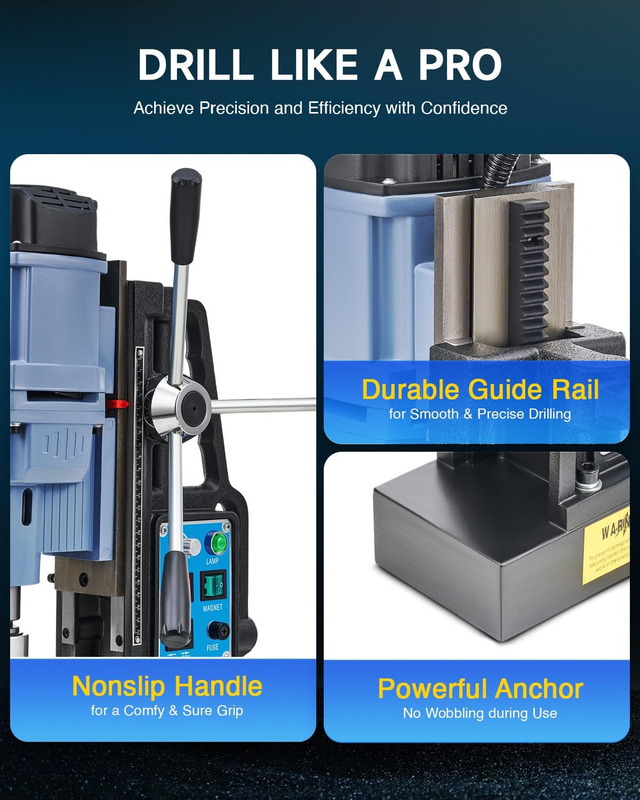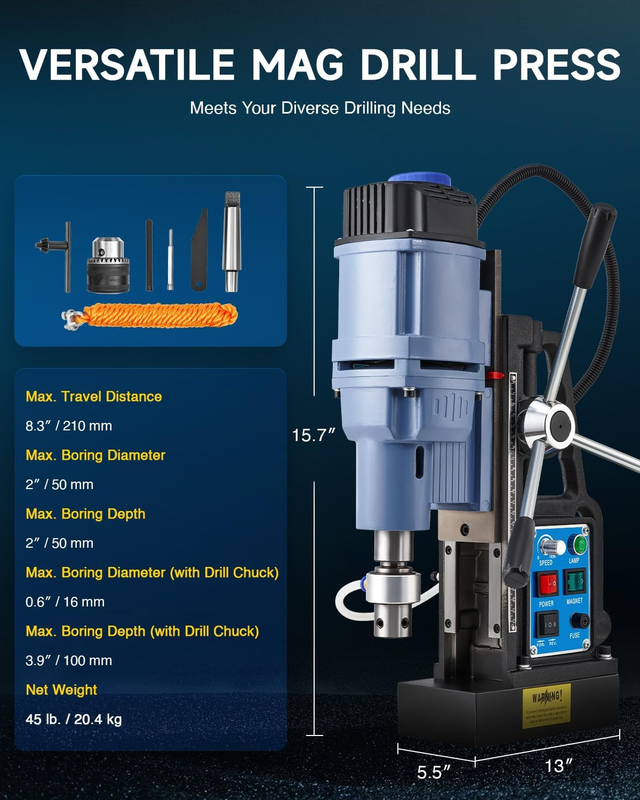 Tackle Most Surfaces with Ease: This magnetic drilling machine allows you to bore into almost any ferrous surface, ideal for ship bridge building, industrial and steel fabrication, windmill power-plant construction, railway manufacture, equipment installation and more!
