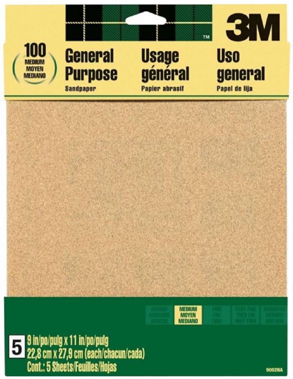 The 3M Aluminum Oxide Sandpaper is a general purpose abrasive that can be used on painted surfaces, bare wood, and metal. for the best sanding results, use this 3M sandpaper with the grain of the wood and work through a sequence of grits from coarse to very fine. These 9 in. x 11 in. medium-100 grit sandpaper sheets come in a pack of 5, and can be cut to size to use by hand, on a sanding block, or a power tool sander.