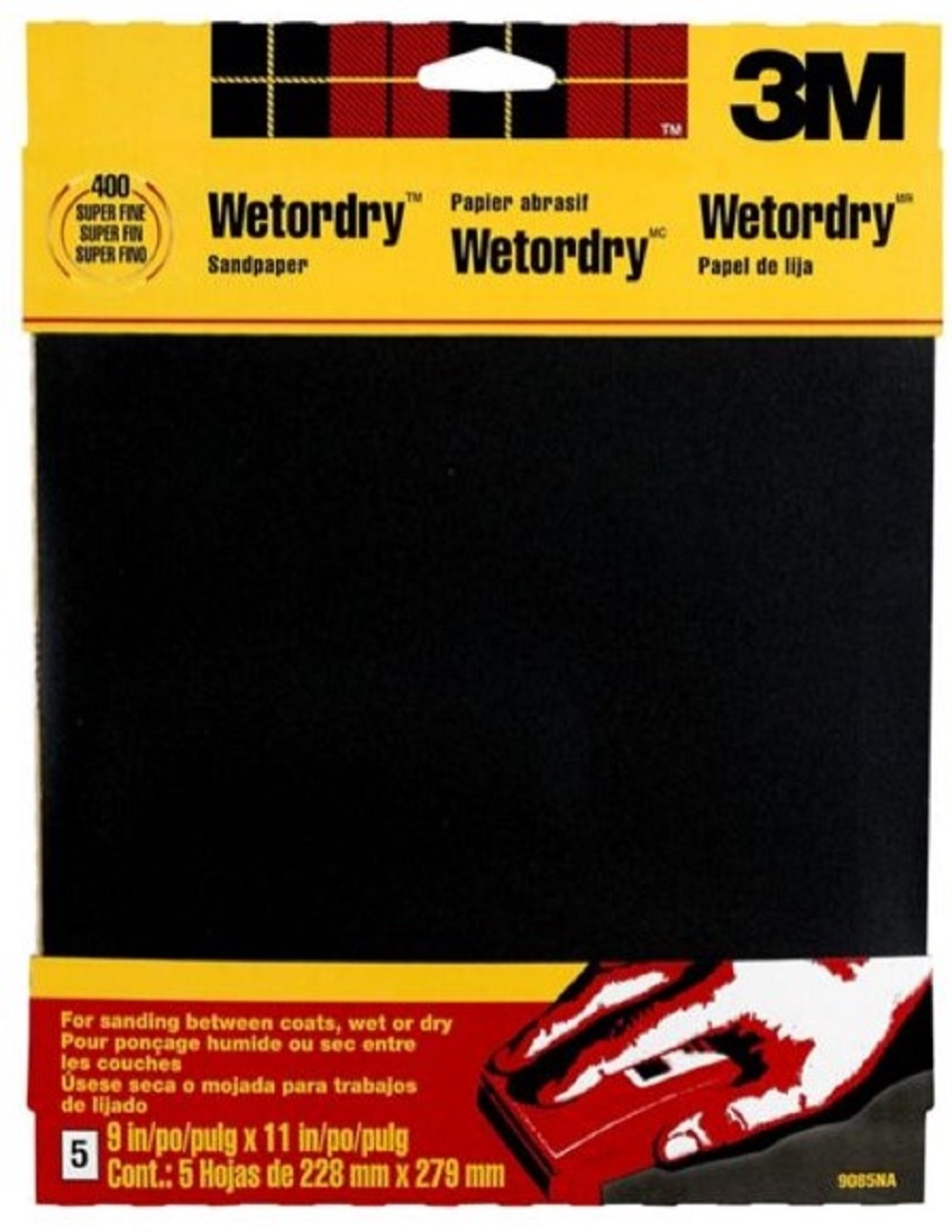 3M Wet-or-dry 400 Grit Sandpaper cuts fast and smooth and can also be used to repair surface defects. This super fine sandpaper can be used with water or cutting oil, but you can also use this sandpaper for metal, when you are repainting, or before applying a primer coat. 5 wet sandpaper pieces come in a pack, and their dimensions are 9 in. x 11 in. each.