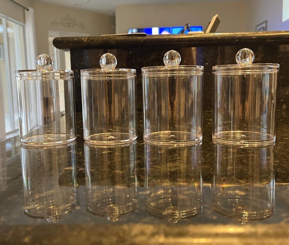 Ideal Size Storage Containers - These canisters are perfect organizer for small objects, quite easy to store and take out, such as Q-tip, cotton ball, cotton swab, cotton rounds, floss picks, tampon, bath salts, hair tie band, makeup brush, beauty egg, face brush, crayons, candy, pens, clip and more small things