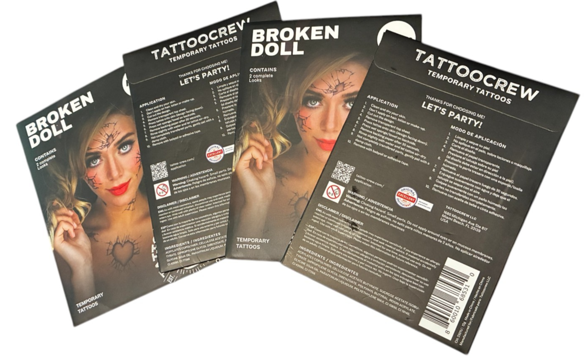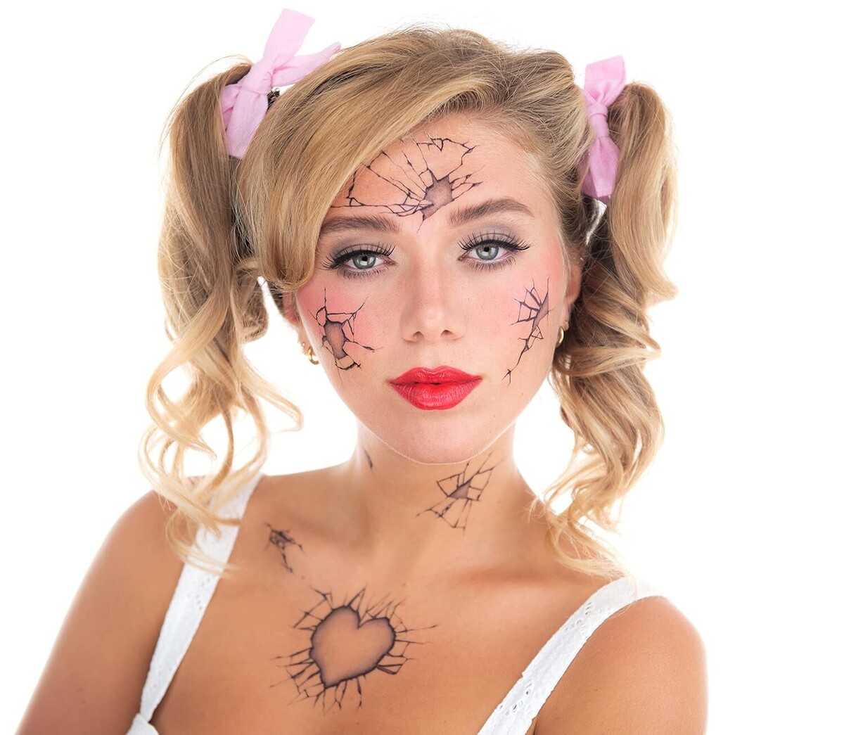 (4 packs) 2 x Broken Doll Temporary Tattoo Halloween Costume for Men and Women, Adult, Face Sticker