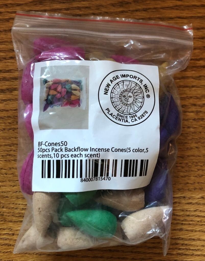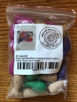 5 scents of 10 cones each: Sandalwood (Light Brown Color), Lavender (Purple Color), Rose (Pink Color), Lilly (Yellow Color), Rosemary (Green Color).