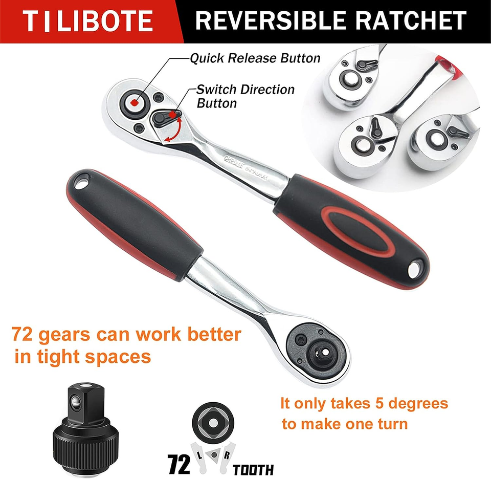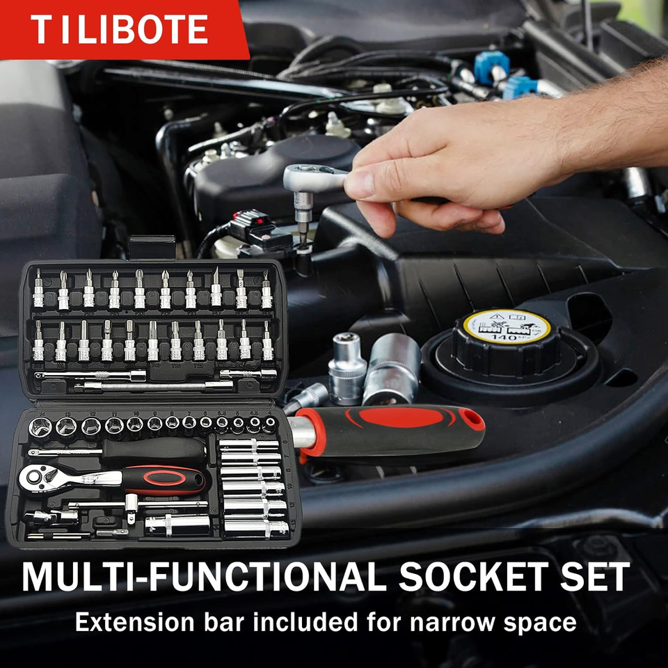 Perfect as a gift or for personal use, this sturdy tool set comes in a convenient storage box, making it easy to organize and transport. Included in the set are a 72-tooth ratchet wrench, multiple extension bars, a sliding T-bar, a spinner handle, a bit adapter, and a variety of sockets and hex wrenches to cover all your repair needs.