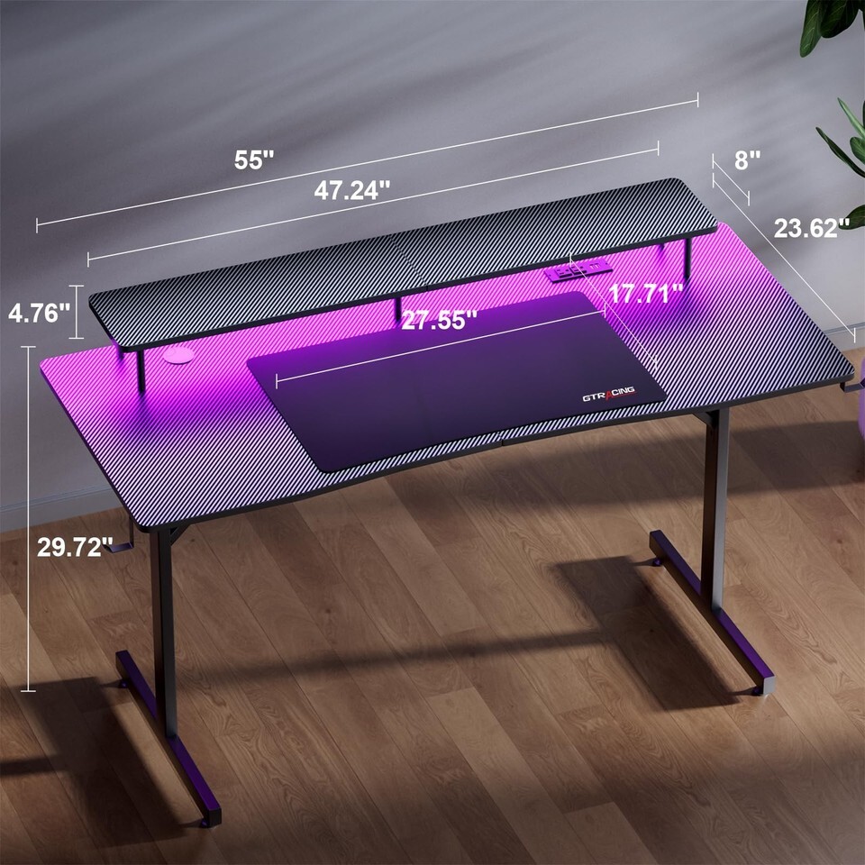 55" Gaming Desk w/ Monitor Stand LED Computer Desk Gamer Workstation Office Home