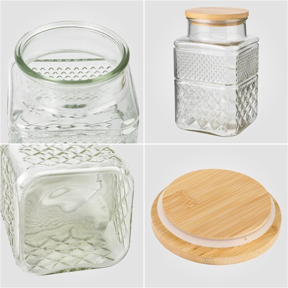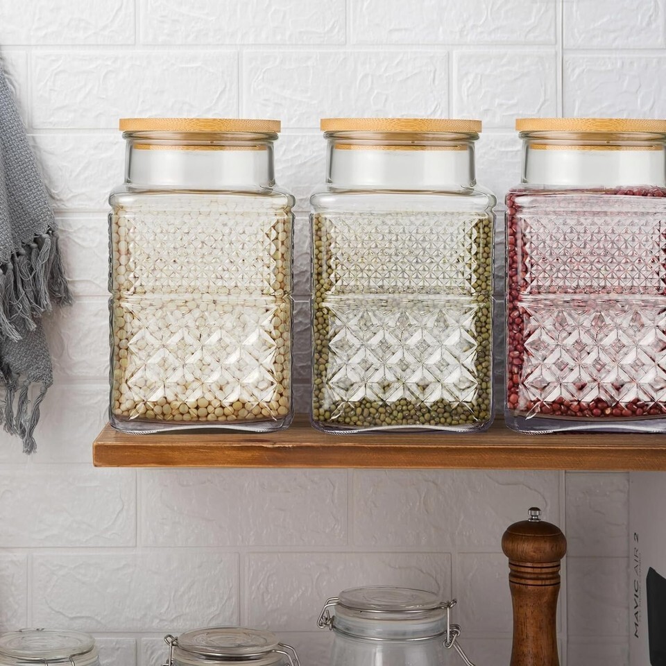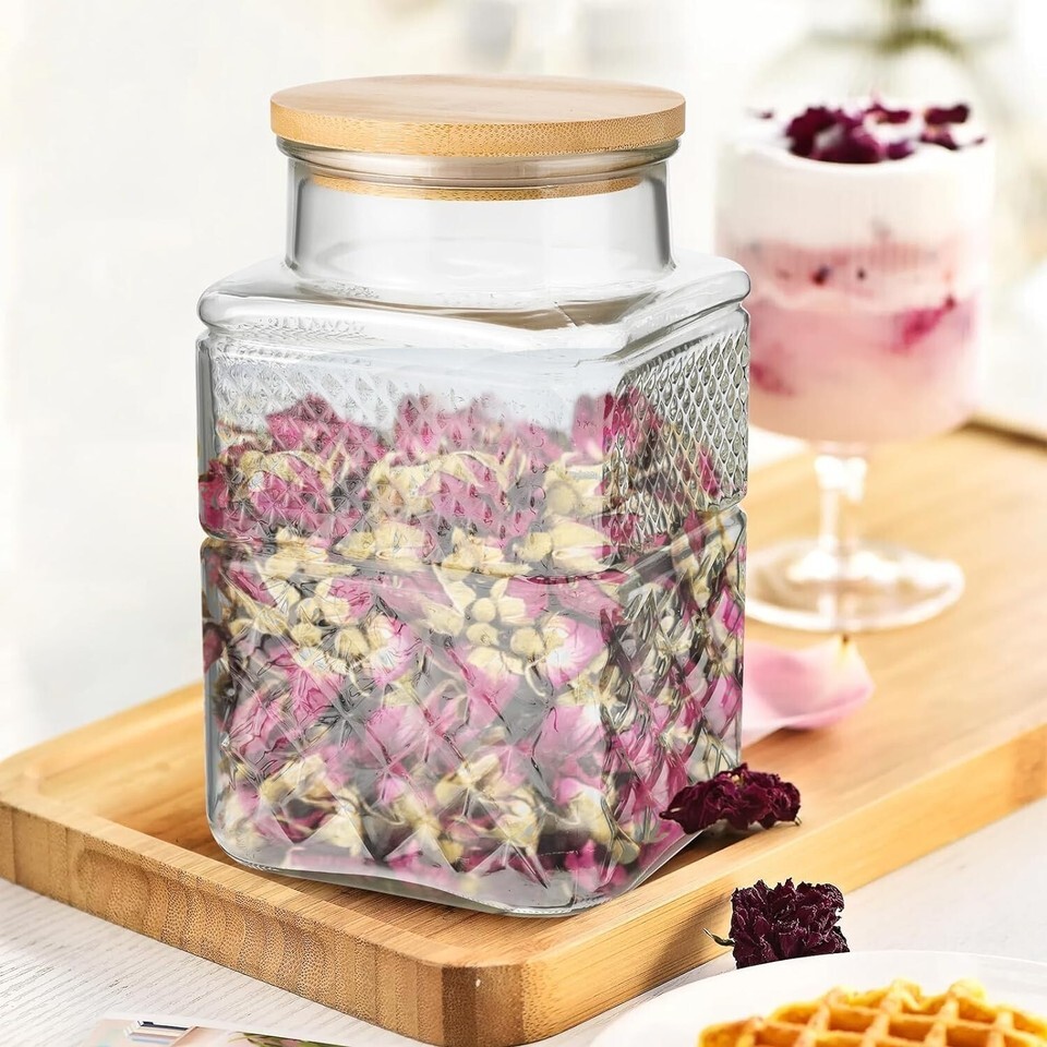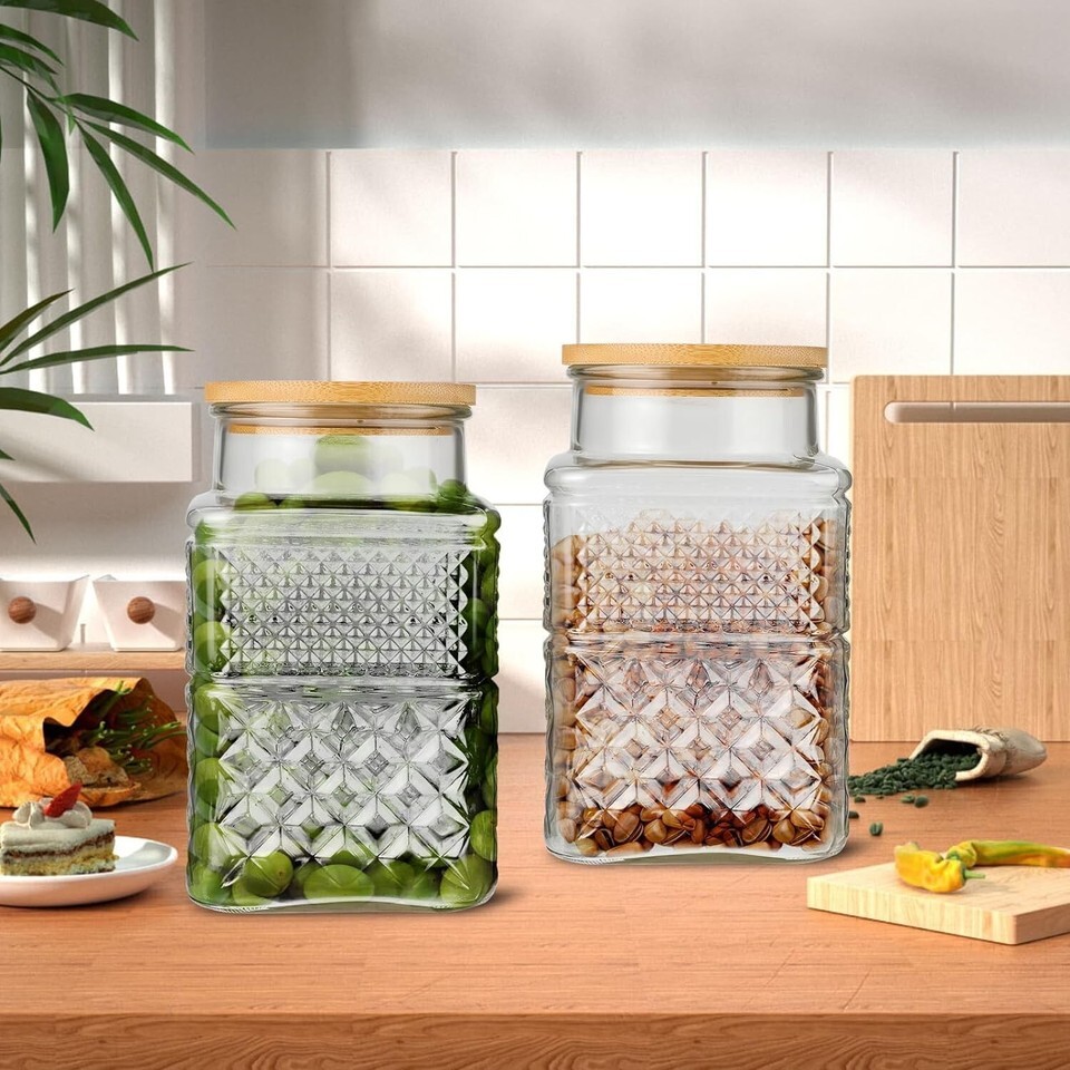 About this item QUALITY MATERIAL: Our airtight glass kitchen canister is made of high quality glass, the thick glass coffee bean storage jar can withstand heavy wear and tear, suitable for daily use. The bamboo lids can only be wiped with a damp cloth, not directly cleaned. AIRTIGHT GLASS CONTAINERS: These square large glass jar with bamboo lid have PP gaskets around the bamboo lids to seal against moisture and keep food dry and fresh for a long time. The unique diamond pattern texture makes them decorative and attractive, a perfect addition to your kitchen pantry. LARGE CAPACITY: The 2pack cookie jars with airtight lids measures 11.5x11.5 cm x 19.8 cm/4.72 x 4.72 x 7.87 inches and has a capacity of 1800 ml (60 ounces), the large-capacity, large kitchen canister is suitable for all your storage needs. WIDE APPLICATION: Airtight storage jars are suitable for storing dry food, suitable for storing jams, sugar, grains, rice, beans, spices, crackers, nuts, loose leaf tea. Food storage jars are perfect for keeping dry ingredients fresh.