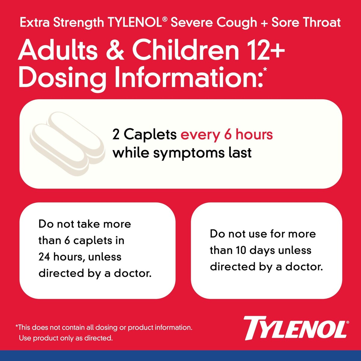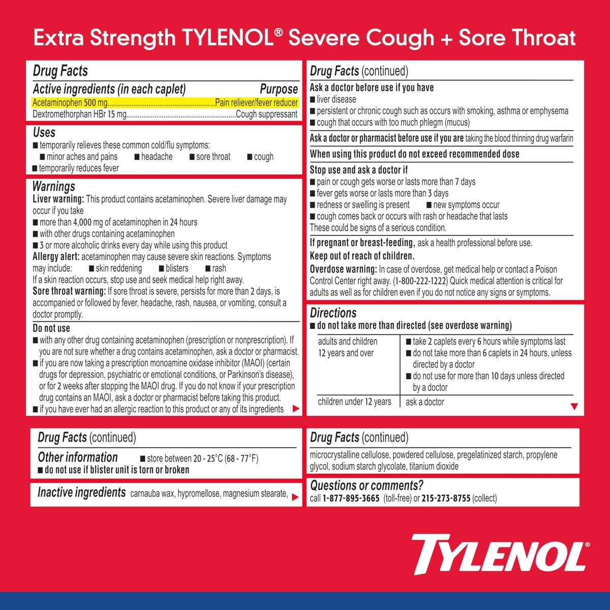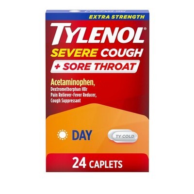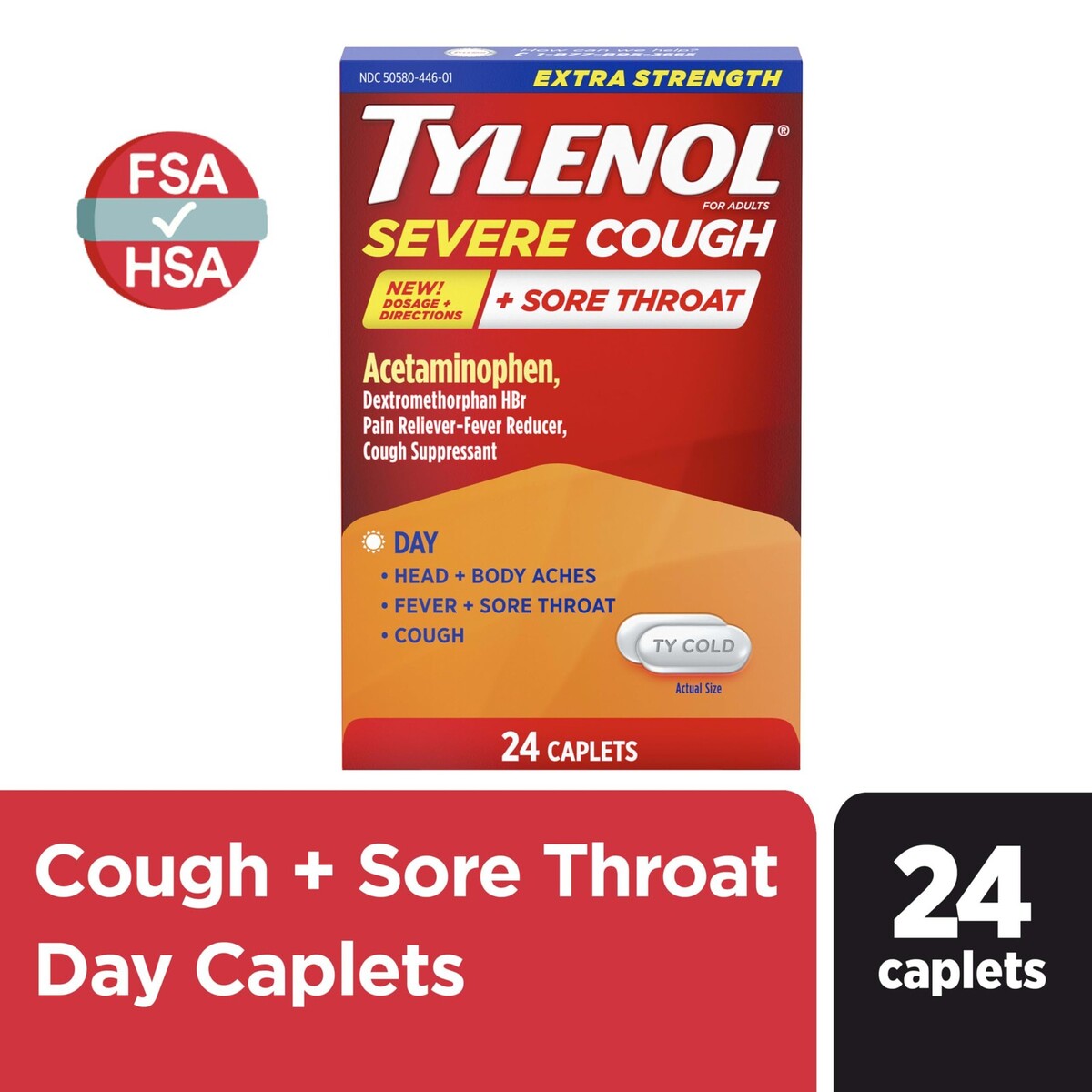 6 Boxes Expiration Date of 5/2026 ? 24-count package of Extra Strength Tylenol Severe Cough + Sore Throat caplets with acetaminophen and dextromethorphan HBr for powerful, multi-symptom relief for your painful sore throat and cough ? The extra strength pain reliever and fever reducer plus cough suppressant caplets help temporarily relieve your daytime cold symptoms. These symptoms include head and body aches, fever and painful sore throat, and coughs ? The maximum-strength, multi-symptom cold and flu medicine is formulated with 500 mg of extra strength acetaminophen to help relieve aches and pains and reduce fever, plus, 15 mg of dextromethorphan HBr cough suppressant to help calm your severe cough ? Stop your cough and sore throat before they stop you. Available over the counter, keep this daytime cold medicine with your sick care supplies for extra strength relief ? Get fast, multi-symptom cold and flu relief with the power of extra strength acetaminophen from Tylenol, the #1 doctor recommended pain relief brand. For adults and children 12 years and older, take two caplets every six hours while symptoms last