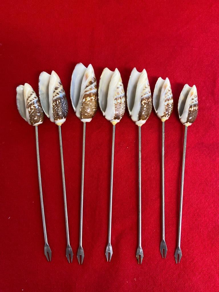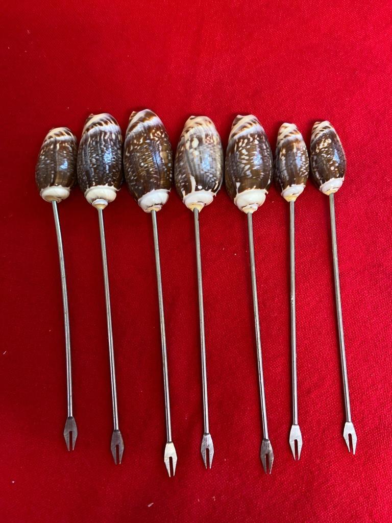 Primary image for 7 Vintage Novelty Appetizer Food Forks Seashell Design w Metal Fork 6" Length
