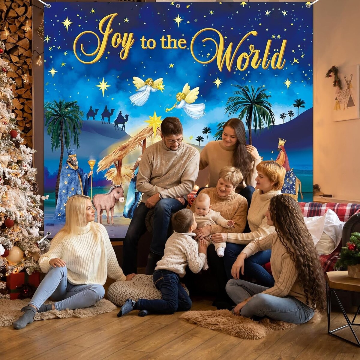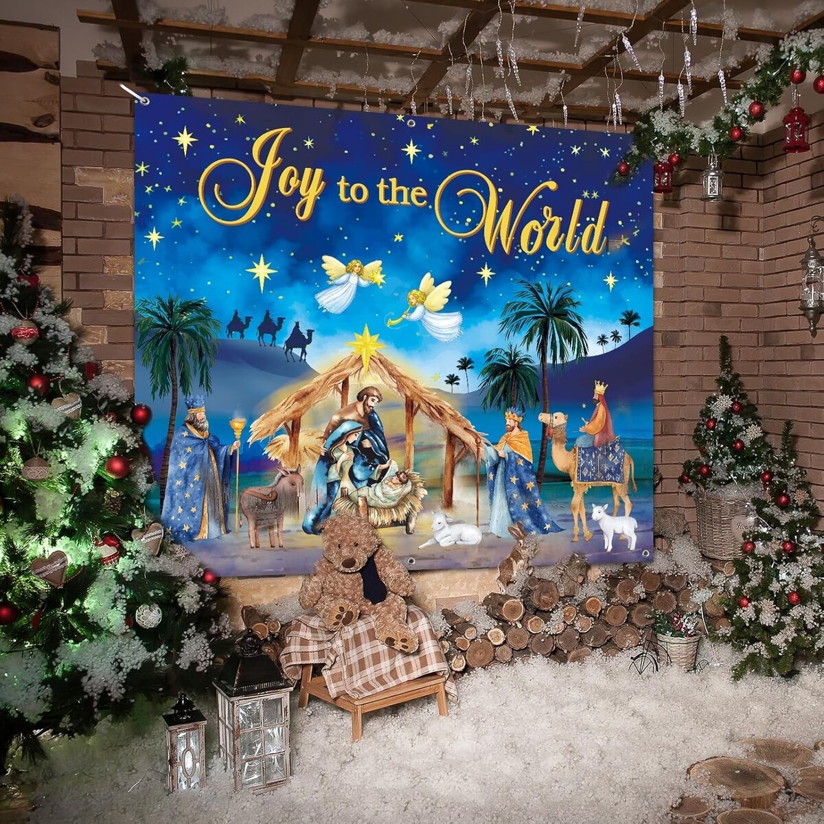 you will get 1 piece Nativity Christmas garage door cover, designed with a sign of JOY TO THE WORLD and Jesus? birth scene on blue background,printed with eye-catching details and lifelike colors.The package comes with 3pcsx 6M rope that can be used to hang the nativity scene backdrop.