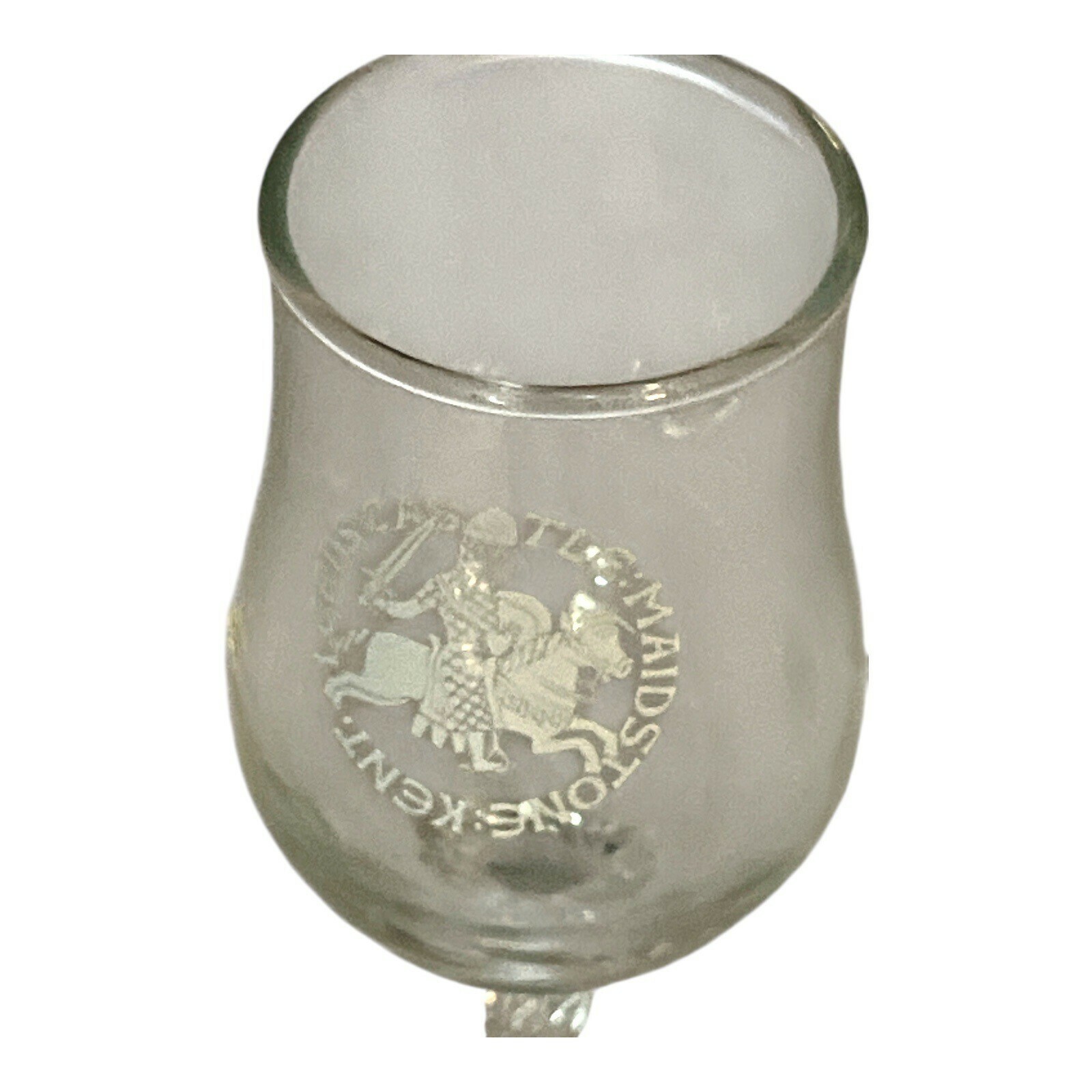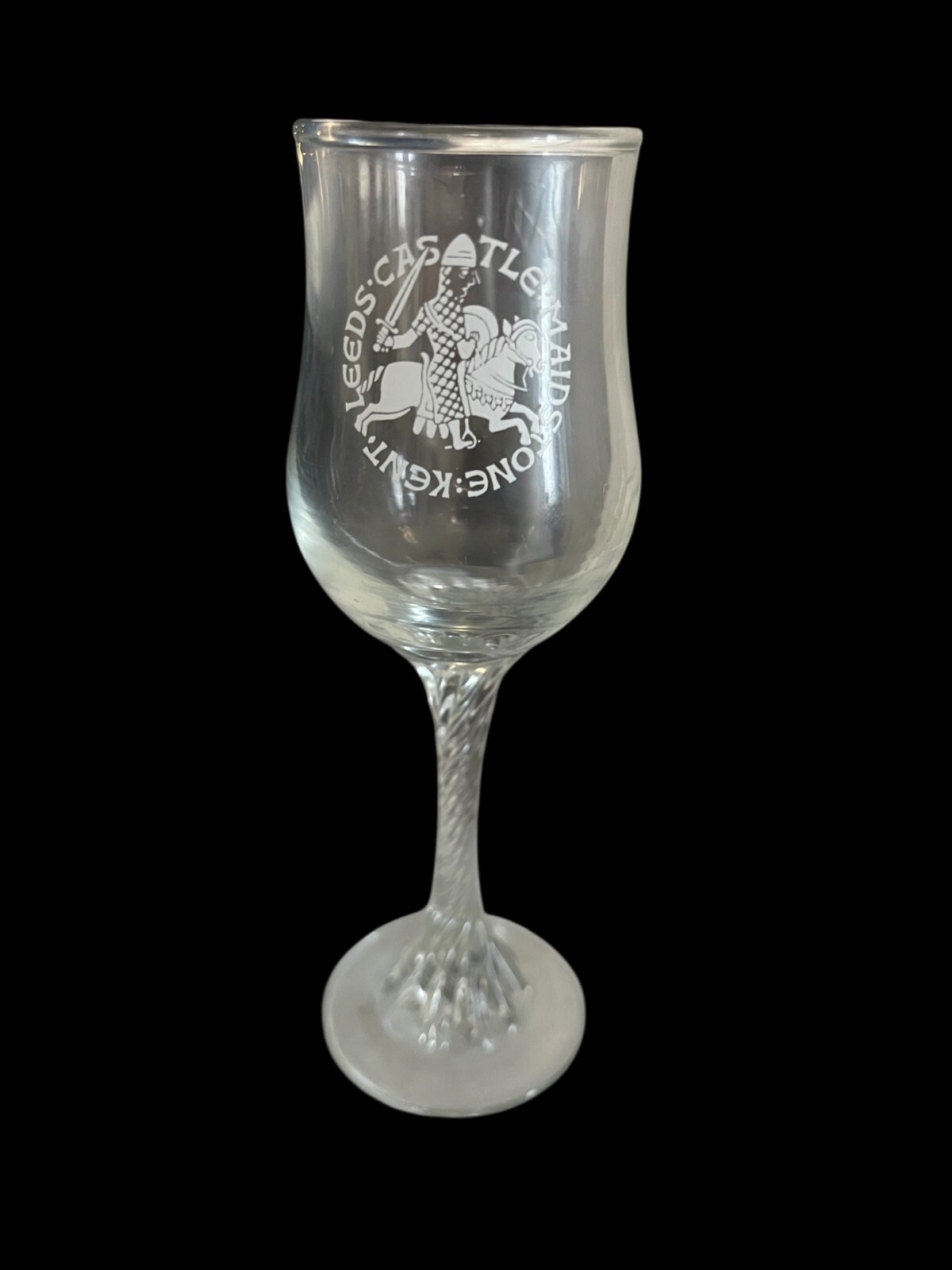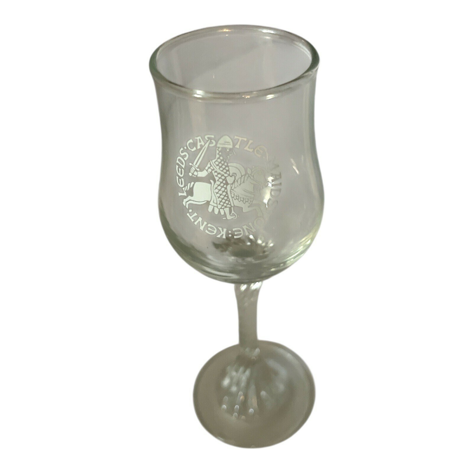 This vintage souvenir goblet features a detailed etched design of a medieval knight on horseback, with the inscription ?Leeds Castle ? Maidstone ? Kent.? The glass stands approximately 5.75 inches tall and has a flared rim and elegant stem. A great collectible from England, likely dating to the 1970s?1980s, this piece makes a unique gift or addition to a barware or travel memorabilia collection.