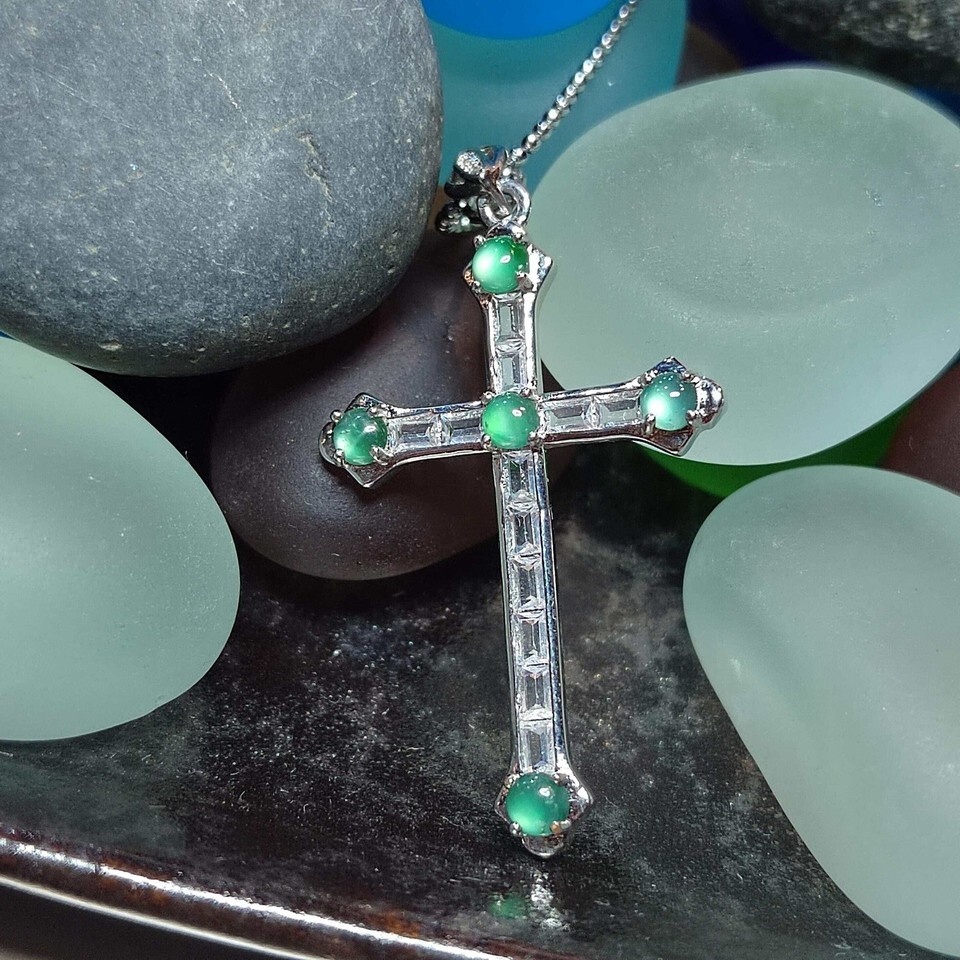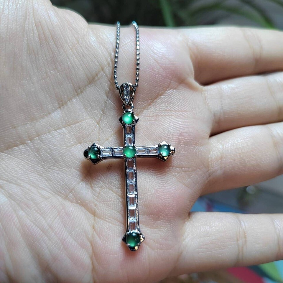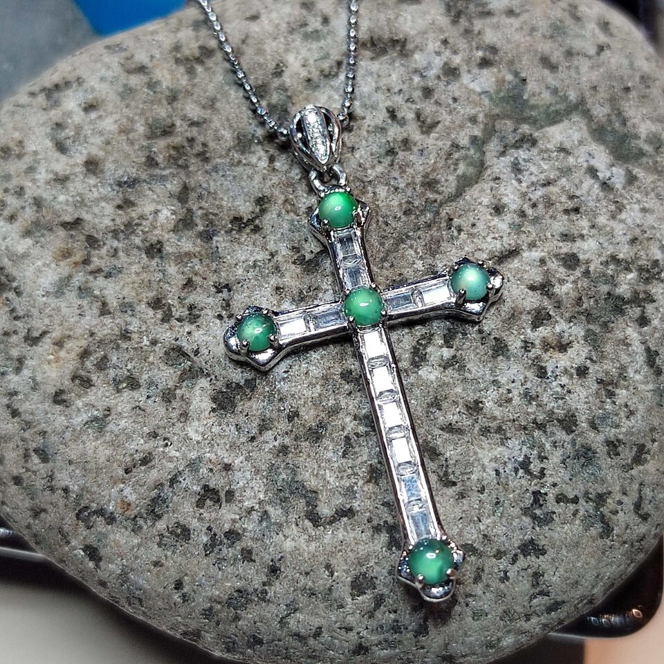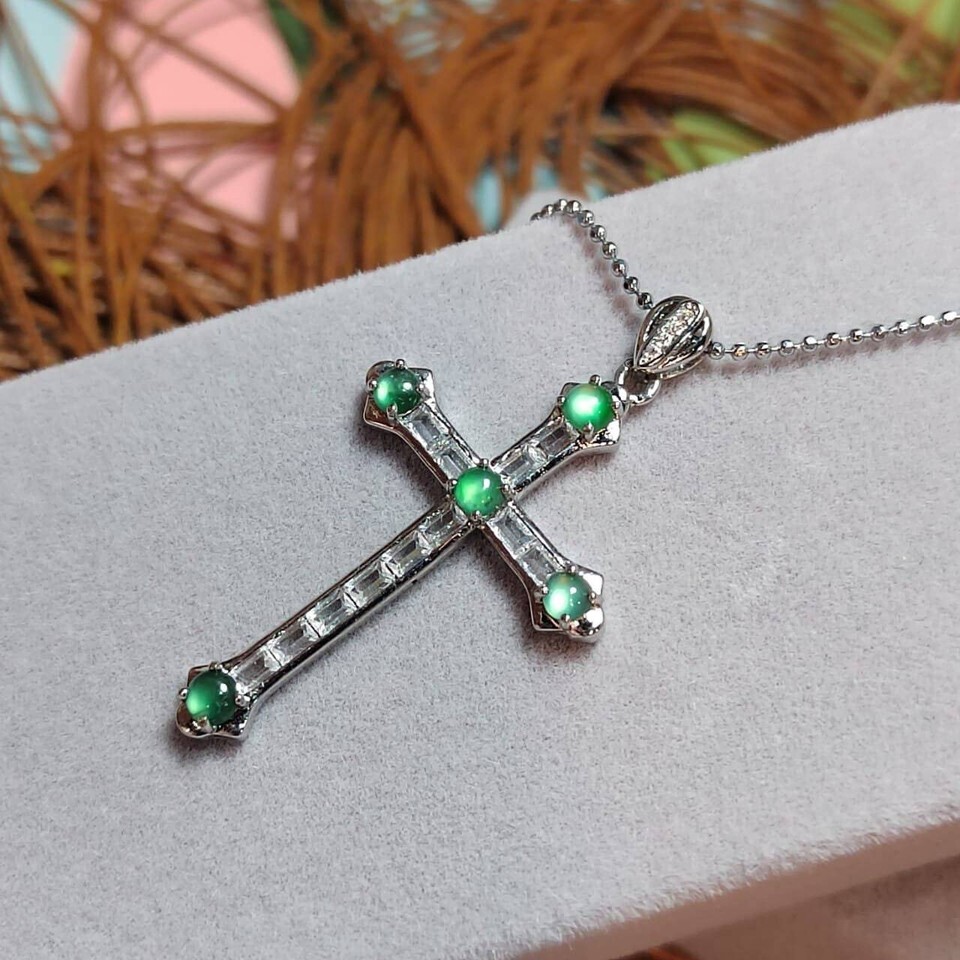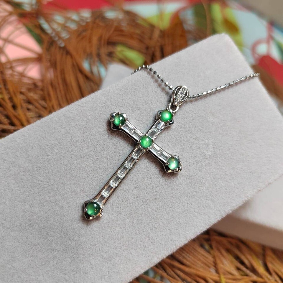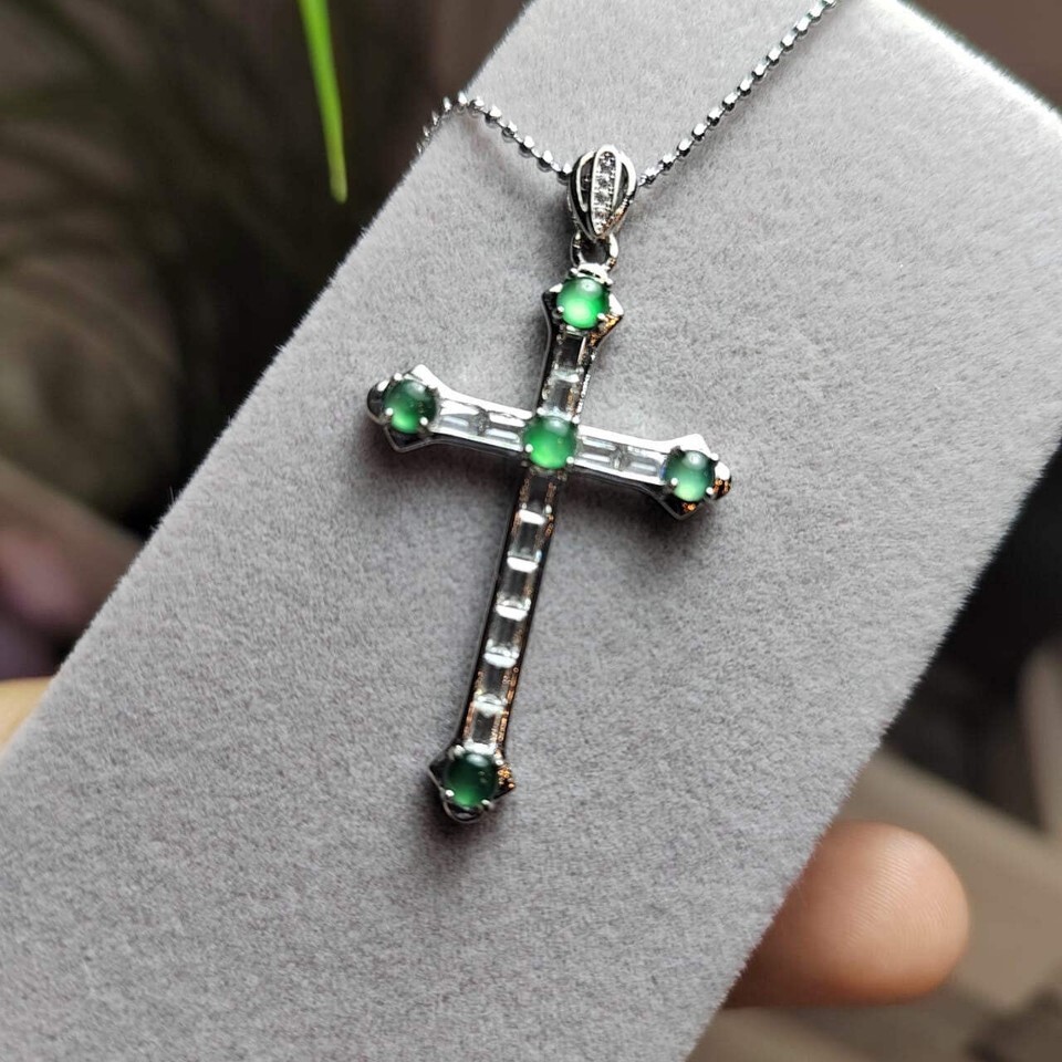 - A-Grade Burmese Icy Light Bulbs Effects Green Jadeite Cross Necklace SL051