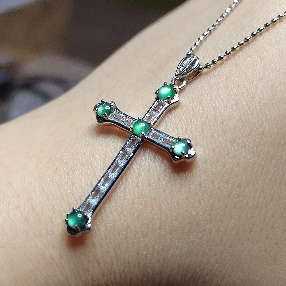 Elevate your elegance and spiritual style with this exquisite A-grade natural Burmese jadeite cross necklace. Featuring a radiant icy green jadeite centerpiece accented with shimmering zircon stones, this pendant is meticulously crafted in a classic cross shape—symbolizing faith, renewal, and inner peace. Suspended from a 45 cm 18K white gold-plated brass chain, it offers a luxurious finish and timeless shine.