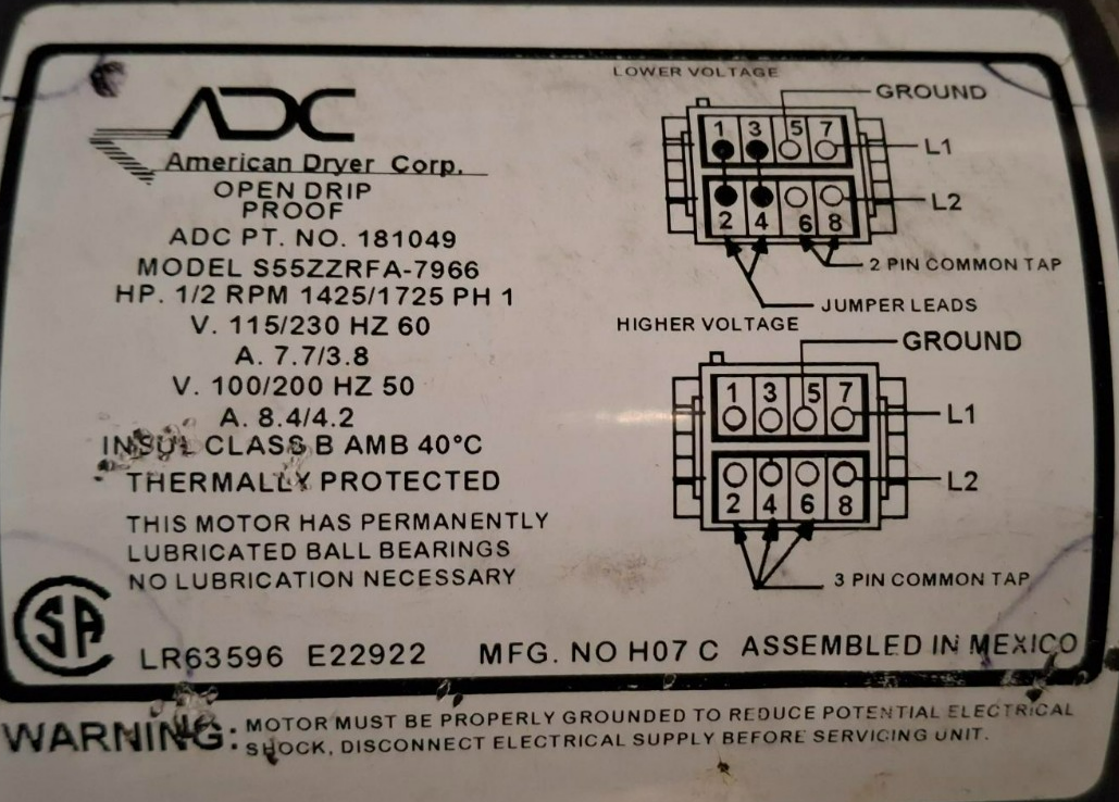 ADC/ MAYTAG DRYER MOTOR WITH 8-PIN PLUG. P/N: 181049 WFR181049 [USED]
