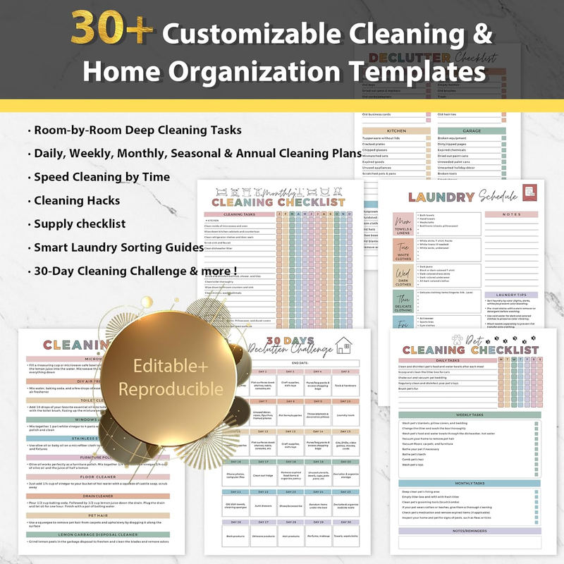 [30+ Templates + Full Customization]The cleaning planner includes 30+ templates for every room and daily task?from kitchens to closets. It also features fully customizable pages, so you can build a cleaning routine that fits your life.