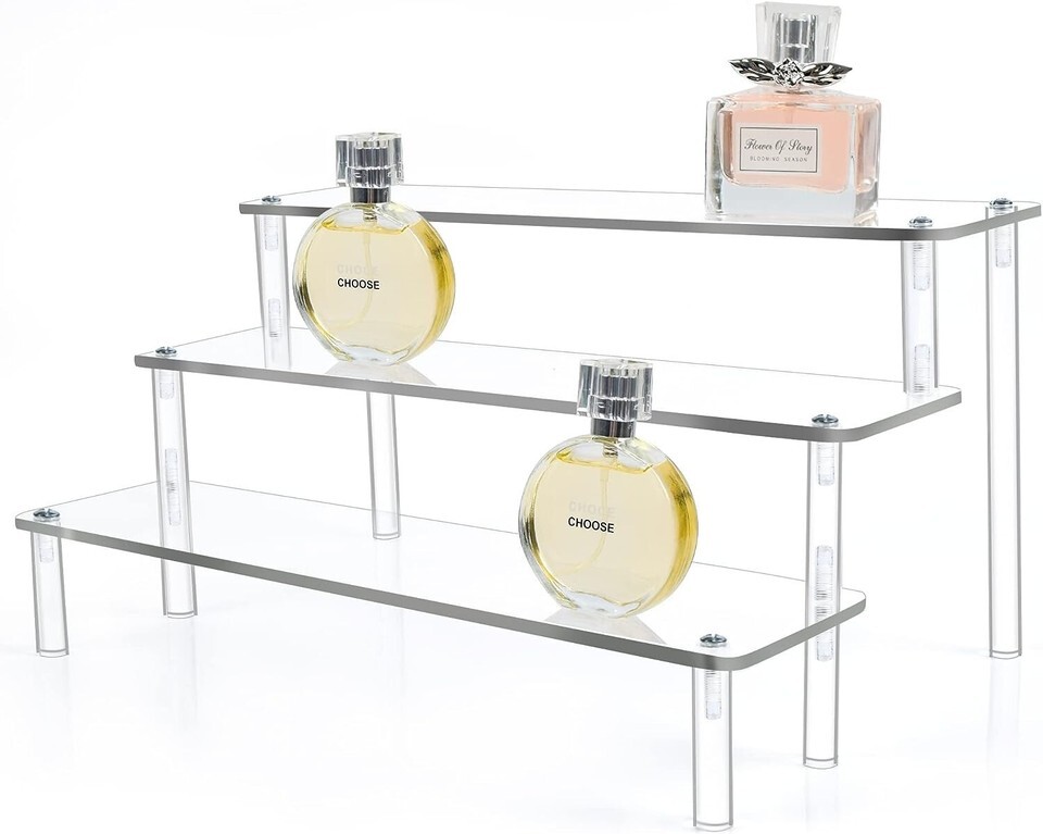 ?Product Size?: Each pannel size of display riser is 11.8in long, 3.15in wide, each tier is 2in high, the total height is 6in, which can holds about 9-12 bottles of perfume.