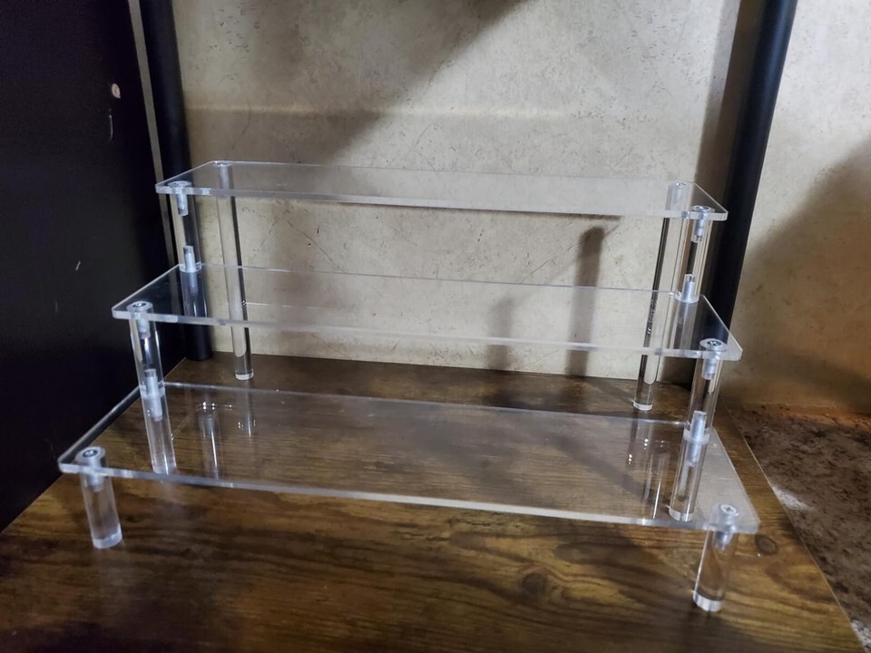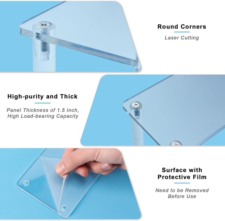 About this item ? Easy to Install ?Our acrylic display stand manual is included in the packaging, allowing you to easily install the stand in seconds, saving you time and energy. Multiple screws reinforce the booth to make it more stable and sturdy, preventing it from shaking and losing your precious collectibles. ? Durable Board ?The acrylic riser is made of 3mm high-purity, high thickness, ultra transparent acrylic material, which is not easy to turn yellow or break, and is durable. Surface laser cutting, smooth corner edges without scratching. Transparent design can complement any decoration, making your item the focus of attention. (There are two thin protective films on the display stands, please remove them before use.) ? Widely Used ?The acrylic riser display shelf can meet all your needs - jewelry, toys, food, cosmetics, collectibles, and more. You can display your collection, use it as a storage rack, dessert shelves for party, and even retail products. You can flexibly display your collection in any way you like! ? Space Saving ?The 3 Tier cake stand, with its layered shelf design, helps maximize your storage space. Say goodbye to the messy counter and welcome a neat and orderly display. Enhance your display experience with this practical and stylish acrylic display risers stand. Its multifunctional design makes it an essential item for antique cabinets, dessert table display set, display cabinets, self-service restaurant tabletops, retail space shelf organizer, dresser organizer, and more. ? Size ? Each acrylic panel is 11.6 inches long, 3.0 inches wide, with a layer height of 1.9 inches and a total height of 5.7 inches. The shelf risers design is simple, durable, and can accommodate items of different weights and sizes. The risers for display has three layers, providing enough space for perfume stand, figures, cosmetics, desserts, cupcake risers, collectibles, etc.