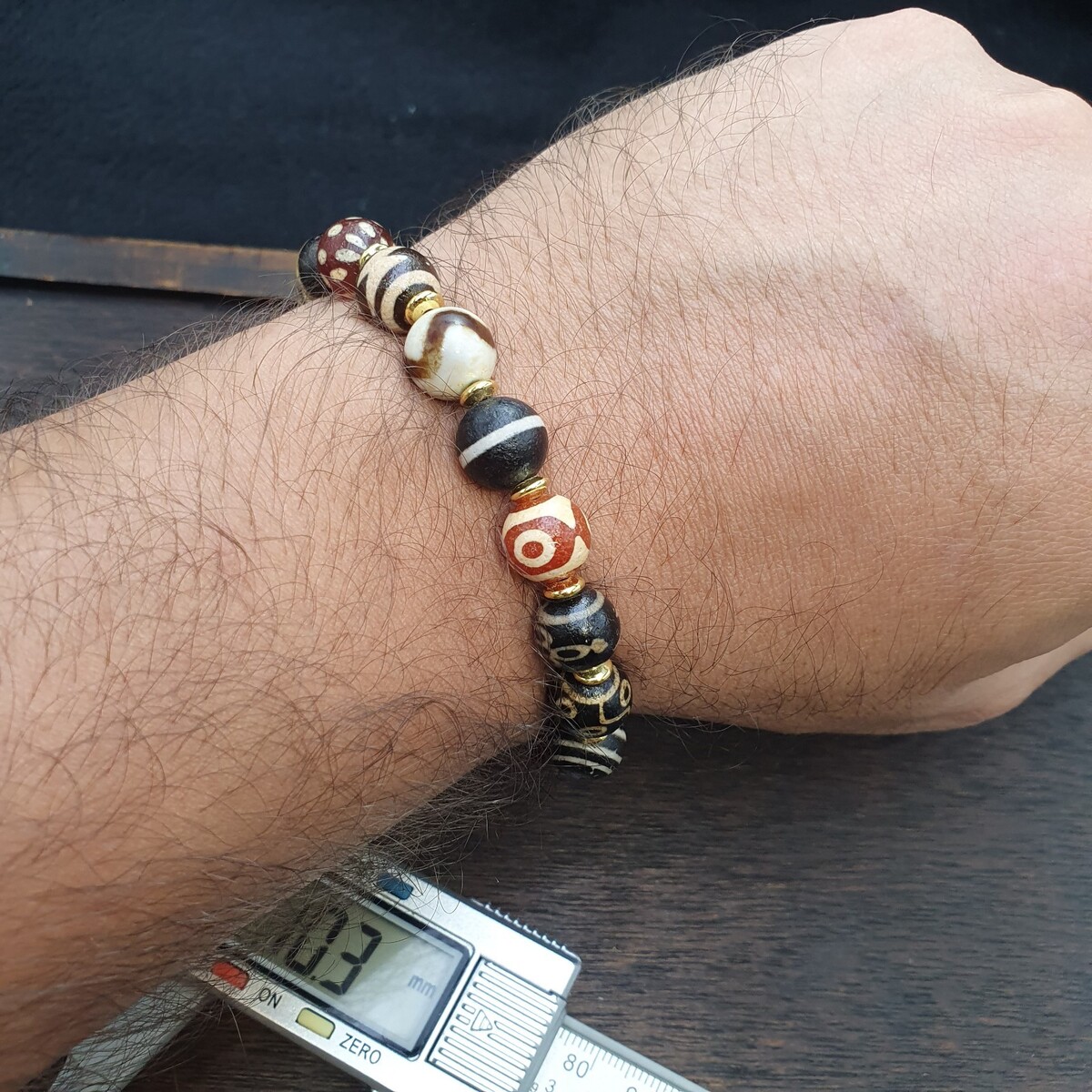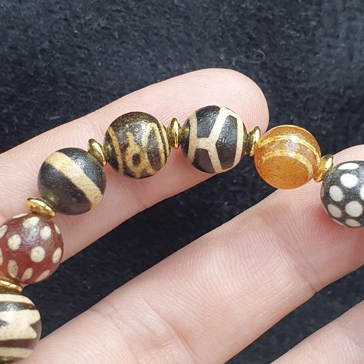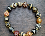 Il bracciale vintage in agata con perline Dzi tibetane e un pezzo spirituale originario del Tibet con simboli protettivi incisi sulle perle di agata. Si ritiene tradizionalmente che le perline multicolori abbiano poteri spirituali e protettivi, rendendolo un pezzo unico e storicamente significativo di antiquariato asiatico. Questo bracciale e un pezzo originale vintage che mette in mostra l'artigianato tradizionale e il simbolismo delle culture tibetana e nepalese, rendendolo una bella aggiunta a qualsiasi collezione o come pezzo significativo da indossare per la protezione spirituale e la guida.