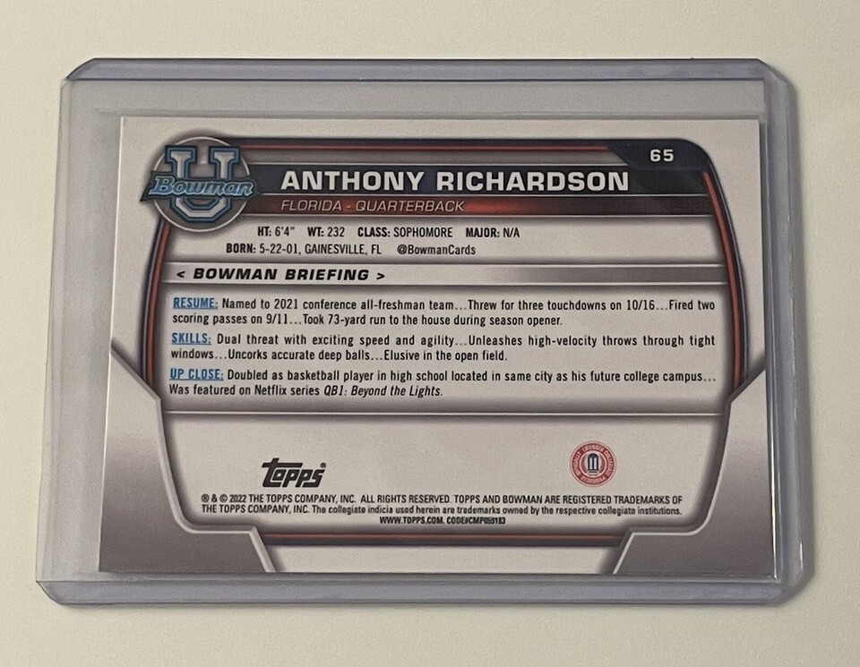 ANTHONY RICHARDSON 2022 BOWMAN U CHROME ROOKIE FOOTBALL CARD-#65-GATORS ???.