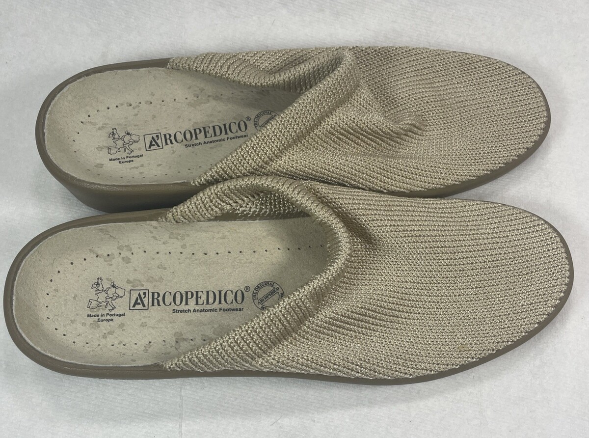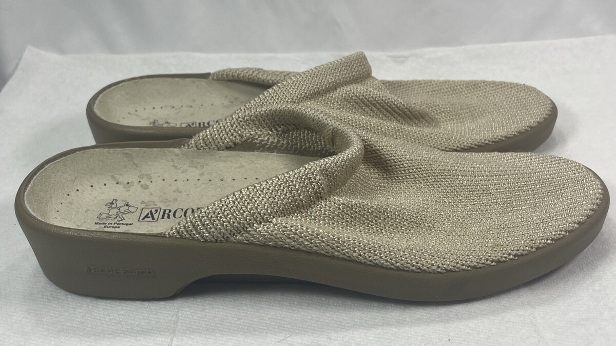 Upgrade your shoe collection with these stylish and comfortable Arcopedico knit flats. The slip-on shoes feature a solid pattern, round toe shape, and arch support, making them perfect for casual wear. The gold color adds a touch of elegance, while the stretch fabric ensures a comfortable fit. Crafted from high-quality nylon, these flats are designed to provide maximum comfort and support. The shoes are made in Portugal. With a standard shoe width of M, these flats are perfect for women's US shoe size 8. Pre-owned, very clean, very good condition, one small place on top of left shoe looks fuzzy. See photos ?